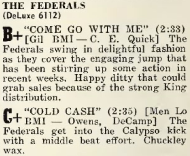 02 57....45—6112....THE FEDERALS..Cold Cash (45—M7097)/Come Go With Me (45—M7098)