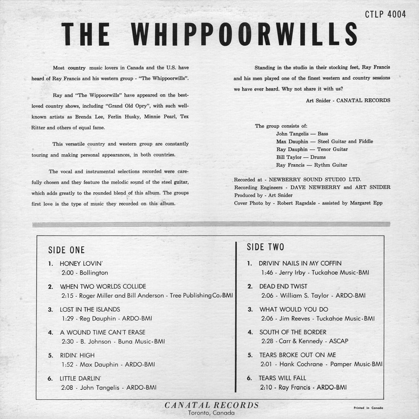 Da Billy die kanadische LP CANATAL CTLP-4004 aus dem Jahre 1964 gepostet hat ist zu erwähnen, dass auch die Kanadier, allerdings etwas später, ihre Whippoorwills hatten. Die Besetzung war John Tangelis, Bass, Max Dauphin, Steel-Gitarre & Fiddle, Ray Dauphin, Tenor-Gitarre, Bill Taylor, Schlagzeug, und Ray Francis, Rhytmus-Gitarre.