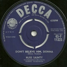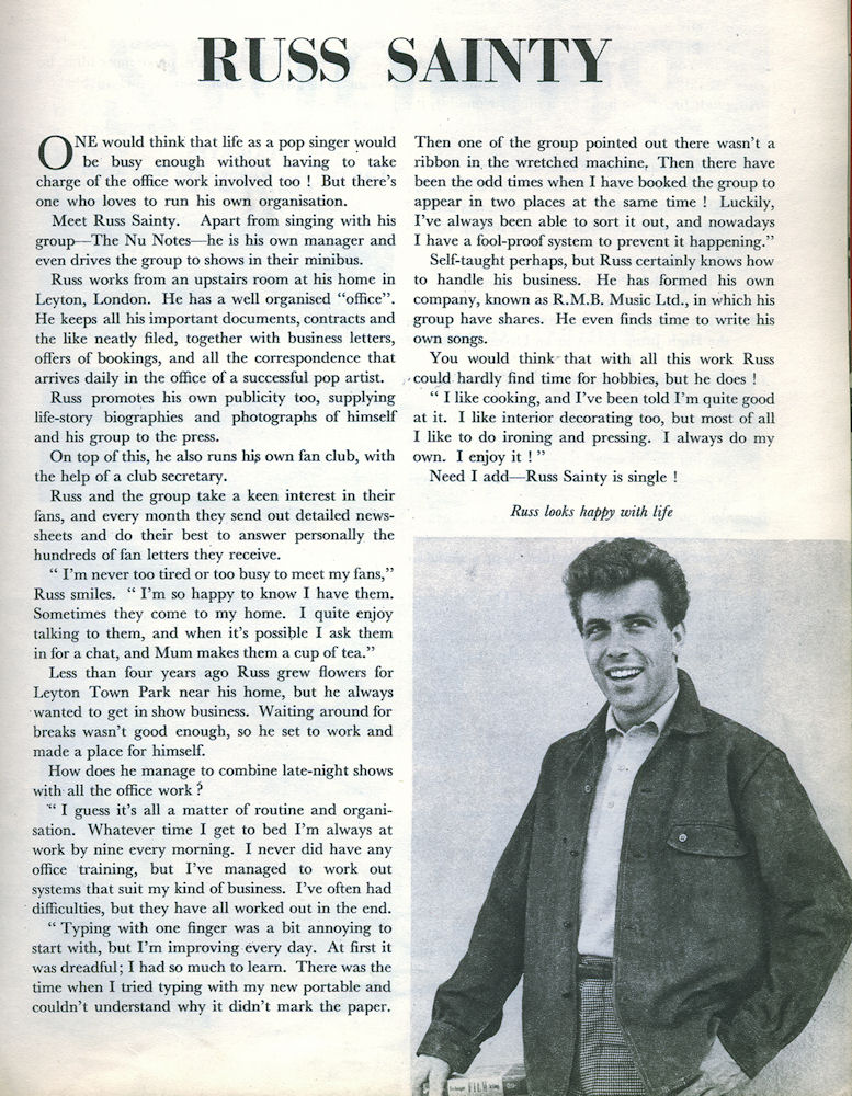 Alfred bekam eine Stelle angeboten und trat das nächste Jahr jeden Abend 20 Minuten lang auf. Er war ein Zeitgenosse von Cliff Richard and the Shadows und wurde oft von Tony Sheridans Band unterstützt. Eine Band namens The 4 Teens aus Stamford Hill suchte einen Sänger und fragte Alfred, der zusagte. Offenbar änderten sie zu dieser Zeit ihren Namen in The Nu-Notes. Sie spielten in Londoner Hallen und Airbases und coverten die großen Hits der damaligen Zeit von Elvis Presley, den Everlys usw., doch obwohl sie kein eigenes Material hatten, waren sie für ihre Gesangseinlagen bekannt. „Alfred“ war definitiv kein „Rock’n’Roll-Name“, und da musste etwas unternommen werden. Eine damalige Freundin meinte, er sähe eher wie ein Russ aus, und der Name blieb hängen. Zu dieser Zeit nahm er den Berufsnamen Russ Sainty an. Ende 1958 lehnte er die Chance ab, Lionel Barts Song “Living Doll“ aufzunehmen, der ein Hit für Cliff Richard wurde.
