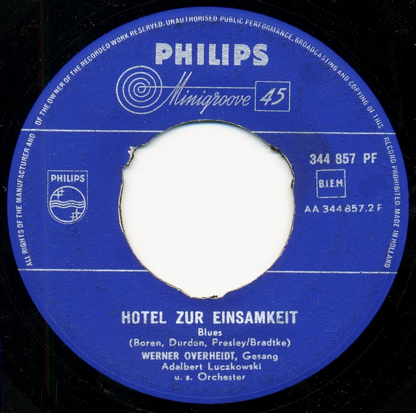 Another point of interest is that (no doubt to the frustration of Sholes) Mae held firm against Hill and Range's approaches to secure the publishing of 'Hotel'. She had promised it to Buddy Killen at Tree Publishing and if you check your CD packaging, you'll see that's where it remains credited to this day