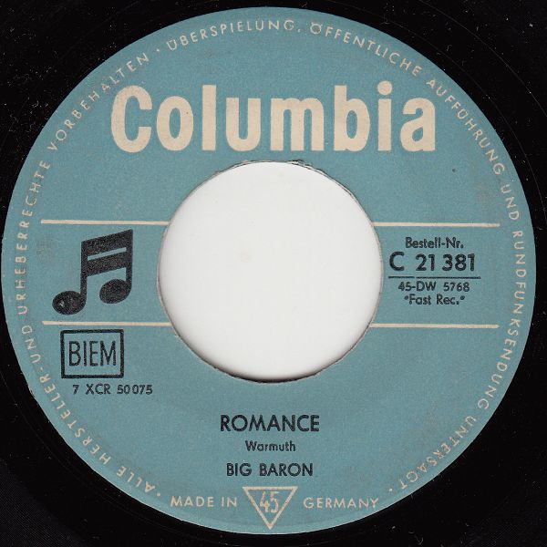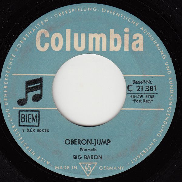 Im März 1960 gab es bei uns eine Single von Big Baron mit zwei Instrumental-Titel, die laut Label-Angabe vom belgischen FAST-Label übernommen wurden. Als Komponist ist bei beiden Titel "Warmuth" angegeben. Im Juli 1960 wurden von der britischen TOP RANK beide Titel übernommen und der Titel "Oberon-Jump" auf "Swinging Bells" geändert. "Oberon Jump" blieb aber als Klammer-Vermerk bestehen. Solche Titel-Änderungen sind nichts besonders Aussergewöhnliches, weit obskurer sind die Komponisten-Angaben. Das umgetitelte "Swinging Bells" stammt plötzlich von Peter Meisel. Es dürfte sich dabei um den deutschen Musikverleger und Produzenten handeln, der am 22. Juni 1935 in Berlin geboren wurde und am 5. Oktober 2010 in Pinehurst, North Carolina, verstarb. Bei "Romance" blieb Warmuth erhalten, er bekam aber als Partner Speith, meines Wissen schrieb der nur Texte, dazu. Ausserdem steht auf der britischen TOP RANK keinerlei Hinweis auf eine Übernahme, weder FAST noch COLUMBIA. Übrigens, bei der belgischen FAST habe ich bis heute keinen Hinweis auf Big Baron gefunden. Wer sich überhaupt hinter Big Baron versteckt, ist auch noch eine offene Frage.