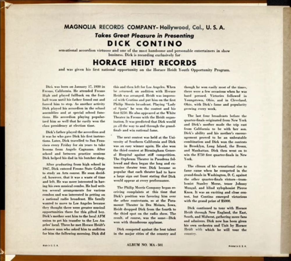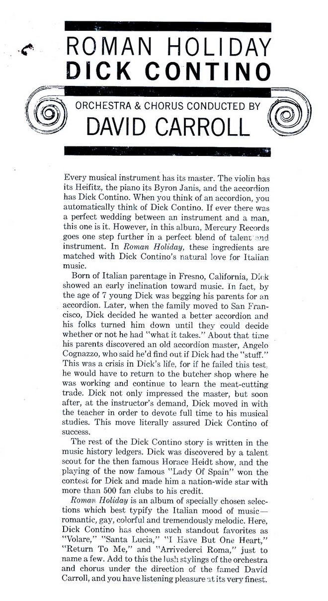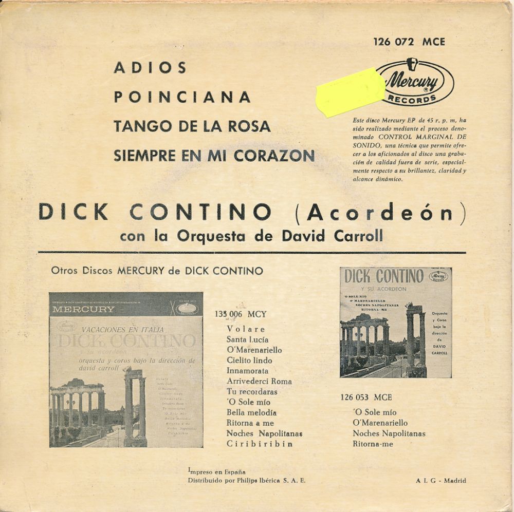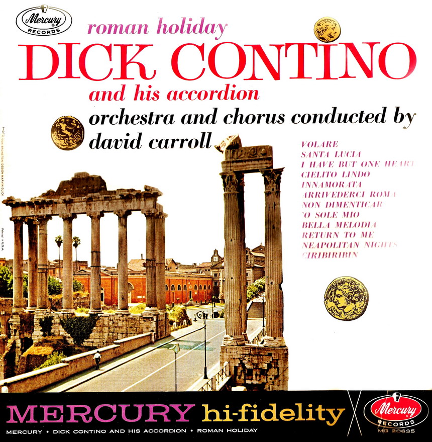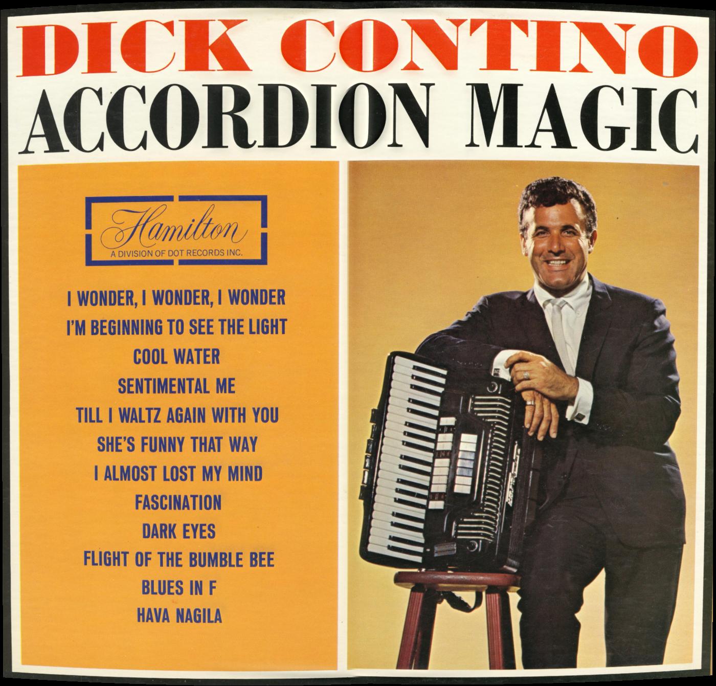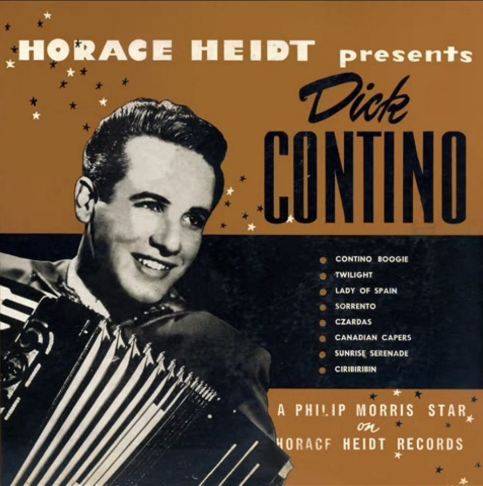 Der Akkordeon-Spieler und Sänger Dick Contino wurde am 17. Jänner 1930 in Fresno, Kalifornien, geboren. Contino studierte in Fresno Akkordeon und erlangte sehr bald eine Virtuosität auf diesem Instrument. 1947 errang er bei einer von der Zigarettenfirma Philip Morris gesponserten Talente-Show den ersten Platz und wurde vom Orchester-Leiter Horace Heidt sofort engagiert, der ihn auf seinem eigenen Label populär machte. 1954 mit "Yours" und 1957 mit "Pledge Of Love" hatte er sogar Charts-Eintritte.