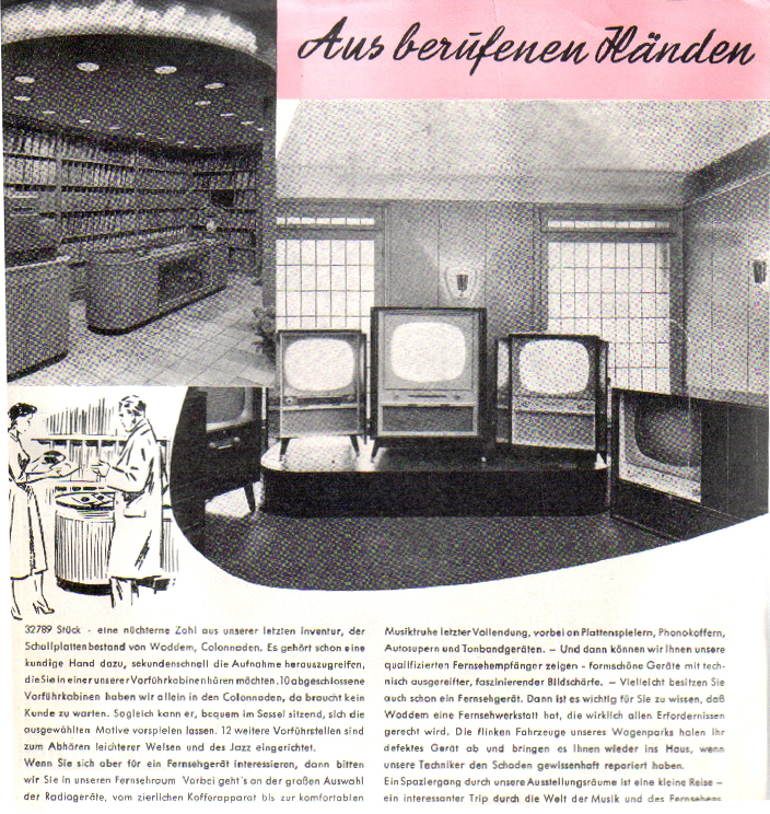vor einiger Zeit stolperte ich auf einem Flohmarkt hier in Hamburg über eine Werbeplatte des Radio/TV u. Schallplattengeschäftes WODDEM. Obwohl sie nur klassische Musik enthielt ("Mit WODDEM in Konzert und Oper" lautet der Titel der Werbeplatte), nahm ich sie mit. Zum einen, da mir der Name durch oft gesehene Aufkleber der Firma auf Covern und Labeln sehr geläufig ist (das Musikgeschäft existiert schon lange nicht mehr) - zum anderen, da innen auch die Schaufenster der beiden Filialen abgebildet waren und sogar der Raum in dem die Schallplatten verkauft wurden.