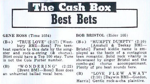 Es gibt einen Schauspieler und Schriftsteller namens Gene Ross der am 9. August 1930 in Austin, Texas, geboren wurde. Der dürfte aber mit dem Sänger und Band-Leader Gene Ross nicht ident sein. Jener Gene Ross der vermutlich etwa 1956 bei SUN in Memphis mit seiner Band die Titel "Everybody's Trying To Kiss My Baby" und ''Little One'' eingespielt hatte und die nicht veröffentlicht wurden, ist unser Mann, von dem aber derzeit nichts weiter bekannt ist. "Everybody's Trying To Kiss My Baby" wurde übrigen erstmals 1995 auf der CHARLIE RECORDS-CD CPCD 8137-17 veröffentlicht.