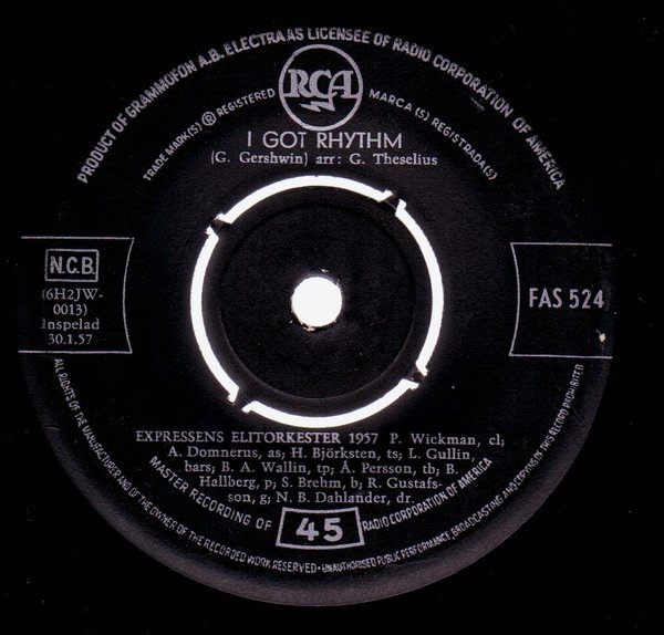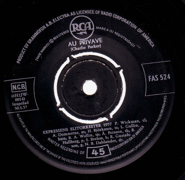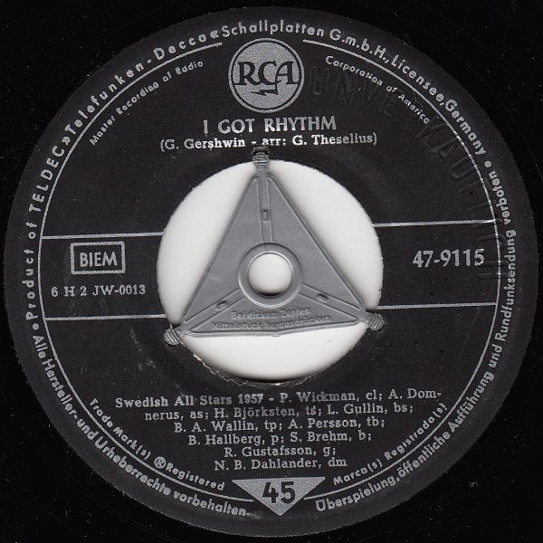 Heute habe ich bei einem kleinen Flohmarkt eine RCA-Single von TELDEC erstanden, wo ich bereits von vornherein gewusst habe, dass es nicht meine Musik ist. Aber mich haben der gute Zustand dieser Single und ganz besonders die Bestell-Nummer 47-9115 gereizt, weil es sich um eine sehr frühe Single der 47-91xx-Serie von TELDEC handelt. Außerdem habe ich mich erinnert, dass ich die "Swedish All Stars 1957" nirgends in Schweden zuordnen und ich daher, wie bei meinen Single-Listen üblich, keinen Klammervermerk mit der Original-Veröffentlichung setzten konnte. Letzteres ist mir aber jetzt endlich gelungen da ich entdeckt habe, dass sich diese Jazz-Formation auf der schwedischen Originalausgabe "Expressens Elitorkester 1957" nennt (siehe Scans aus dem Netz) und einmal puren Jazz anhören ist auch keine schlechte Abwechslung.