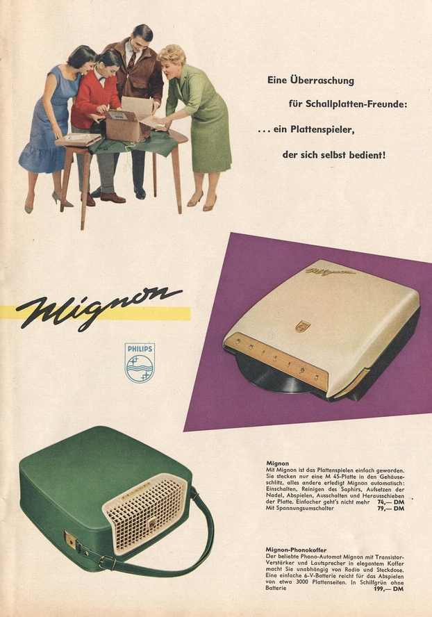 heute möchte ich Euch eine seltene(?) Werbeplatte für den Mignon Plattenspieler vorstellen. Über den Mignon viele Worte zu verlieren ist nicht nötig. In den 50ern war er der Kultplattenspieler der Jugend. Soweit mir bekannt ist mußte das feste silberne oder goldene Mittelstück der London-, RCA- und anderer Plattenlabel entfernt werden um die Platten anzuhören. Möglicherweise war dies mit einer der Gründe für die vielen fehlenden Original Mittelstücke dieser Platten.