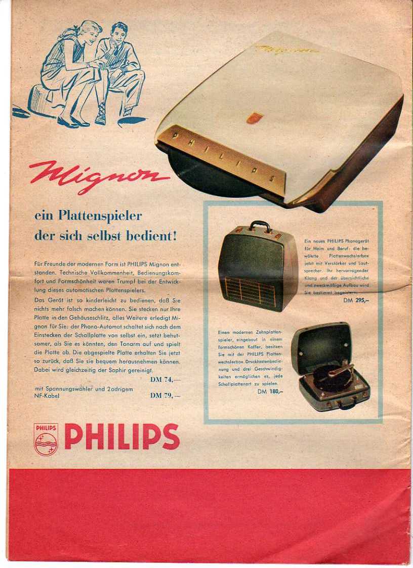 Was die Werbeplatte betrifft so sind hier im Stil der Klingenden Post einige Titel des aktuellen Philips Programms angespielt. Allerdings passt die Zusammemstellung nicht zur Zielgruppe der Mignon Benutzer. Aus Seite 1 befinden sich Schlager von Willy Hagara, Nana Gualdi, Leo Leandros und weitere inkl. einem Blasorchester. Lediglich der Titel Yes tonight, Josephine von Johnnie Ray kann mit dem Rock `n´ Roll in Verbindung gebracht werden. Die zweite Seite ist ganz der klassichen Musik gewidmet.