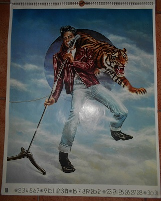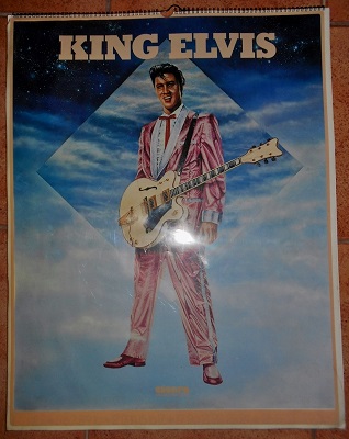 Absolute Rarität: 12 von Günter Blum, Heidelberg gemalte große Plakate von Elvis Presley präsentiert in Form eines großen Litho-Wandkalenders. Dimensionen: 63 cm x 49 cm. Jedes Plakat auf einem gesonderten Blatt. Die Monate sind mit römischen Ziffern bezeichnet. Geschützt werden die von einer Spirale gehaltenen Blätter durch eine transparente Plastikfolie. Inschrift KING ELVIS. Hersteller-Hinweis und Copyright 1981: CICERO ART INTERNATIONAL, Stuttgart in Zusammenarbeit mit TOM BROX PRODUKTION, Mannheim. Zustand M- (nur leichte Gebrauchsspuren an den Ecken).