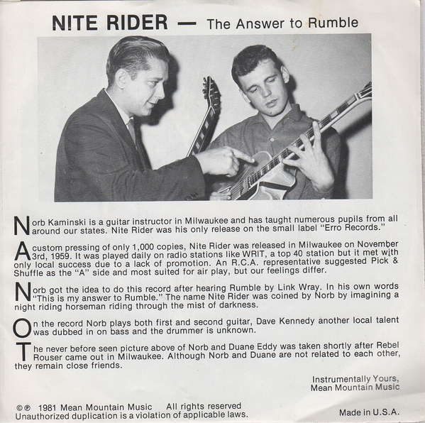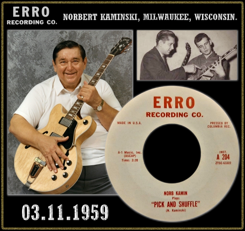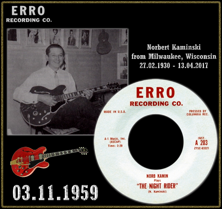 Der Gitarrist Norb Kamin wurde 1930 in Kenosha, Wisconsin, als Norbert J. Kaminski geboren. Es gab von ihm lediglich eine Instrumental-Single, die aber mehr als 20 Jahre später neuerlich aufgelegt und mit einer Bildhülle versehen wurde, wo sich auf der Rückseite eine Kurz-Bio des Musikers befindet. Siehe dazu Scan aus dem Netz.