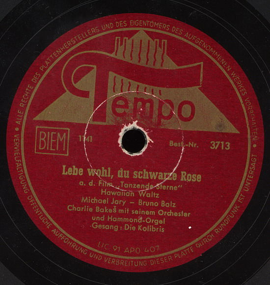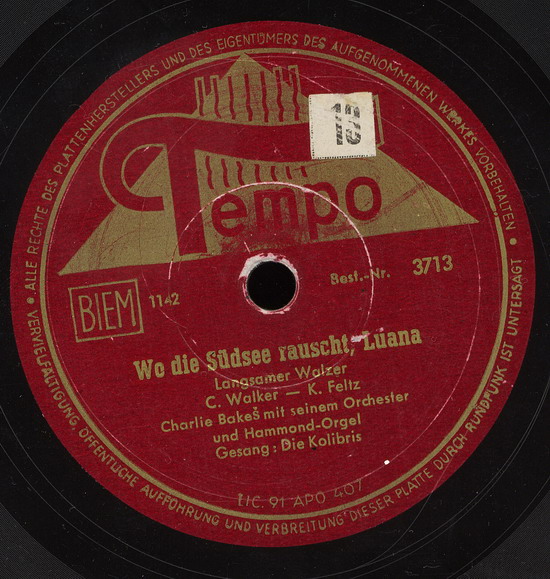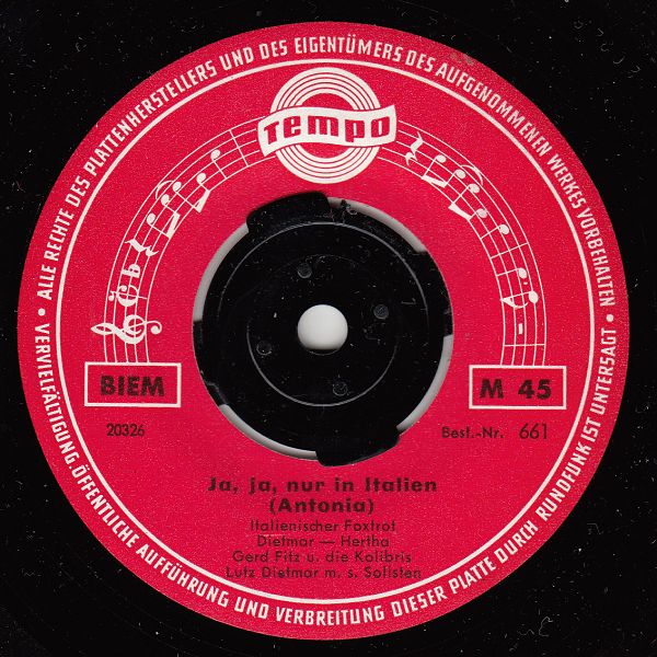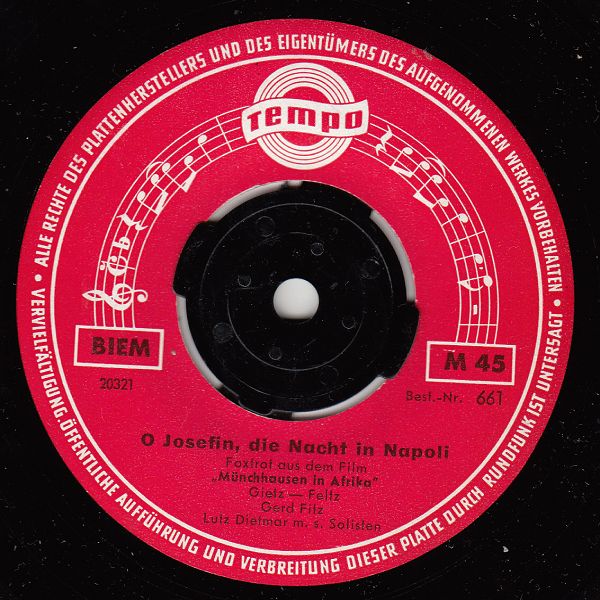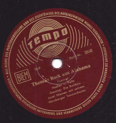 ab Oktober 1952 Tempo (u.a. "Frauen Und Wein" & MARIO COTTA, "Lebe Wohl, Du Schwarze Rose"/"Wo Die Südsee Rauscht, Luana", "Die Süßesten Früchte", "Es Hängt Ein Pferdehalfter ...." & GERD STEFFENS, "Thomas Rock Aus Alabama"-Ende 1956, "Smoky"/"Oklahoma-Tom"-1956 & JOSEF NIESSEN mit seinem Nürnberger Tanzorchester, "Ja, Ja Nur In Italien (Antonia)"-1958 & GERD FITZ, "Schönes Mädchen Vom Rio Negro"-1959),