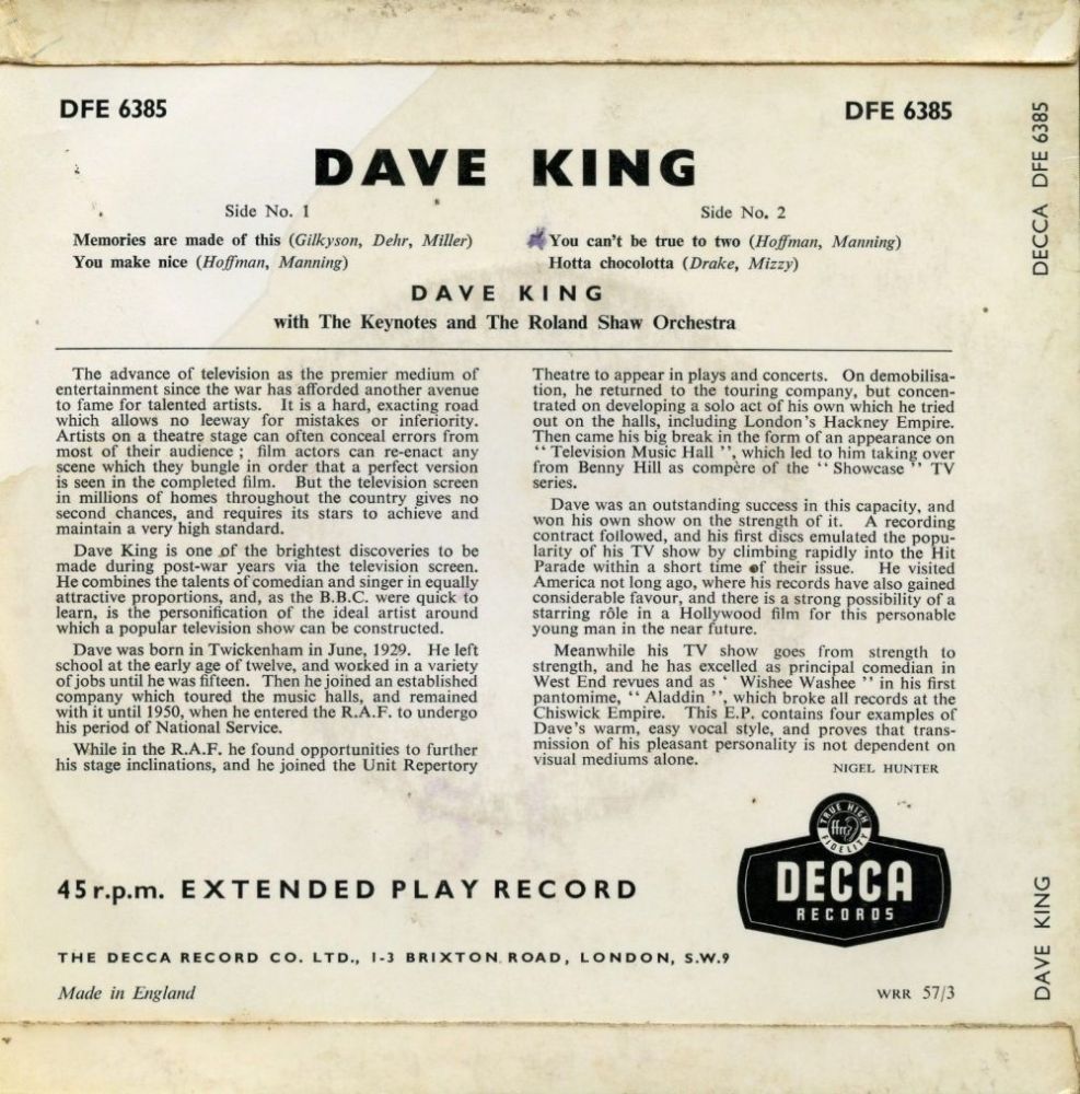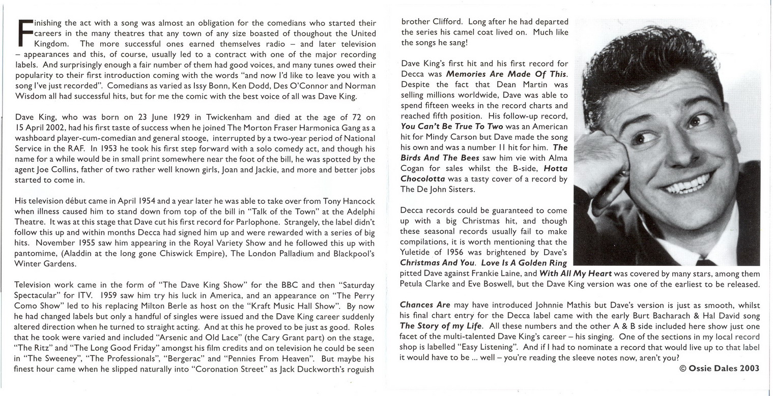 Der britische Schauspieler, Komödiant und Schlagersänger Dave King wurde am 23. Juni 1929 in Twickenham, Middlesex, England, als David Kingshott geboren und verstarb am 15. April 2002 in London, England. In den Fünfzigern startete er seine Dave King Show mit Gesang, Tanz und "Comedy", welche sehr populär war, insbesondere wegen der berühmten Gäste, die er jedesmal vorstellen konnte. Als äußerst populärer TV-Star nahm er auch Schallplatten auf, wobei er einfach gängige Schlager coverte und damit viermal die britischen Charts eroberte.