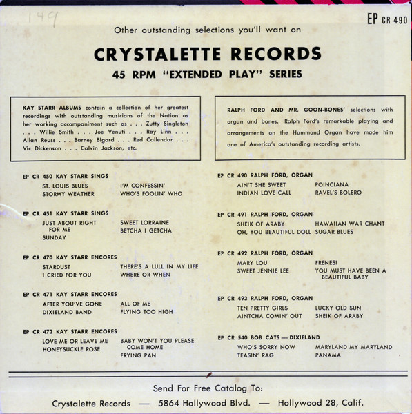 07 49....CR-605....RALPH FORD & MR. GOON-BONES Ralph Ford - Hammond Organ Ted Goon & His Goon Bones Hammond Organ & Goon-Bones Novelty Arrangement of:..Oh, You Beautiful Doll (S 1210)/Sweet Jennie Lee (------)