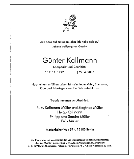 der Sänger, Mitglied einiger Gesangsensembles und Chorleiter Günter Kallmann ist am 26.04.2016 verstorben.
