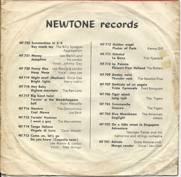 Angeblich bestand die Formation The Newtone Five aus spontan zusammengesuchten Studio-Musikern beim belgischen NEWTONE-Label. Beim deutschen Label 777, welches mit dem belgischen Label NEWTONE in Verbindung stand, gab es auch Newtones, für die keine Besetzung zu finden ist. Bizarrerweise soll die deutsche Pressung der Newtones 777 60-1201 auch in Belgien von NEWTONE vertrieben worden sein. Andererseits scheint bei Übernahme der NEWTONE 706 durch 777 auf der deutschen Pressung der Zusatz "Newtones" auf, obwohl es sich bei den Tigers eindeutig um Dan Ellery handelt (links klicken). Gibt es da einen Zusammenhang und wenn, welchen ? Es bleibt eine ziemlich bizarre Sache.