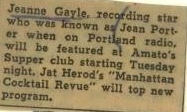 Die Sängerin Jeanne Gayle wurde 1914 in Montana als Martha M. McBride geboren und lebte dann in Portland, Oregon, wo sie in den Dreißigerjahren mit ihren Schwestern Virginia, geboren 1913, und Hazel, geboren 1915, als Mitglied der McBride Sisters auftrat. Für ihre Solo-Auftritte verwendete sie den Bühnennamen Jean Porter und als solche lernte sie in Portland den Musiker und Orchesterleiter George Bruns kennen, den sie 1940 heiratete. Als ihr Gatte den Posten eines Musikdirektors bei KEX angeboten wurde, zogen sie nach Los Angeles, wo Martha ihre Solo-Karriere bei CAPITOL mit ihrem neuen Bühnennamen Jeanne Gayle fortsetzte.