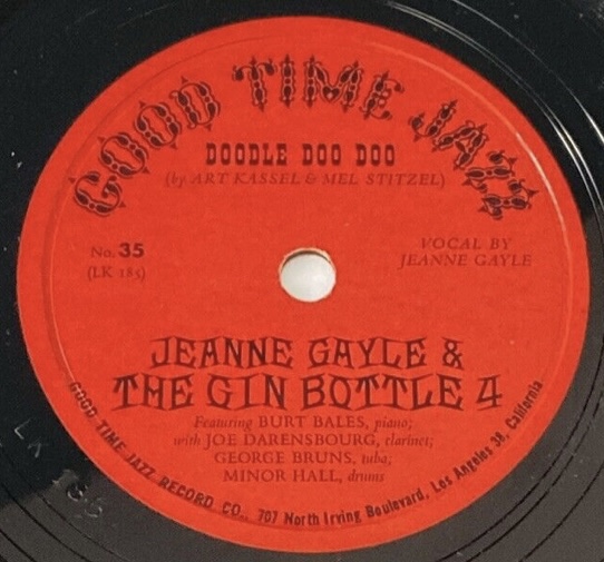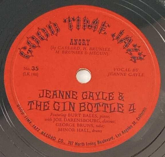 ?? 51....No. 45035....JEANNE GAYLE & THE GIN BOTTLE 4 Featuring BURT BALES, piano; with DARENSBOURG, clarinet; GEORGE BRUNS, tuba MINOR HALL, drums..Angry (LK-185)/Doodle Doo Doo (LK-186)