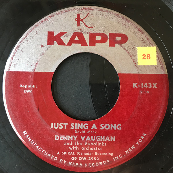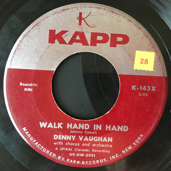 04 56....K-143X....DENNY VAUGHAN with chorus and orchestra..Walk Hand In Hand (G9 OW 2951)/DENNY VAUGHAN and the Bobolinks with orchestra..Just Sing A Song (G9 OW 2952) (CDN: SPIRAL 7)