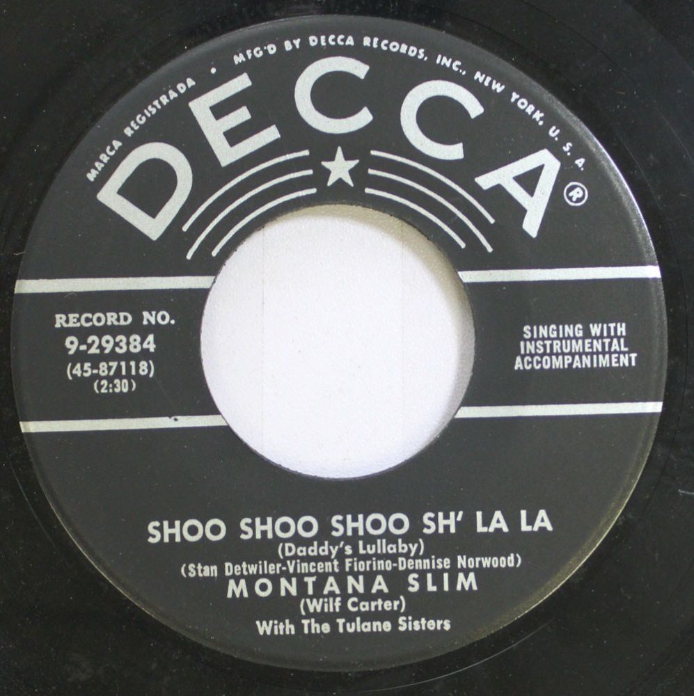 01 55....9-29384....MONTANA SLIM (Wilf Carter) With The Tulane Sisters..Shoo Shoo Shoo Sh' La La (Daddy's Lullaby) (45-87118)/MONTANA SLIM (Wilf Carter)..My Mountain High Yodel Song (45-87113)