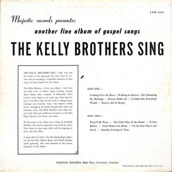 Die Kelly's dürften im Rahmen ihrer Tourneen irgendwann in Cleveland, Tennessee, gelandet sein und bei dieser Gelegenheit bot ihnen MAJESTIC RECORDS an, eine Gospel-Song-LP im "weißen Stil", ich denke da beispielsweise an Red Foley, zu gestalten, was letztendlich zur Entstehung der MAJESTIC LPM-1005 führte.