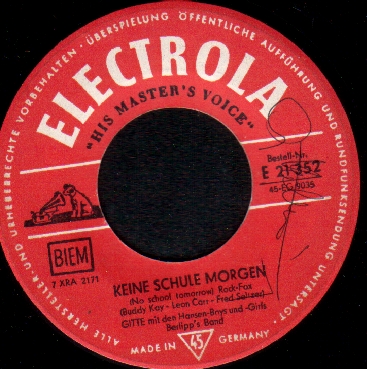 "Keine Schule morgen" ist eine klasse R+R/Jive Aufnahme der damals noch recht kleinen Gitte (siehe Coverfoto - schmunzel