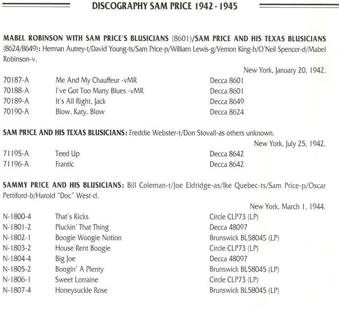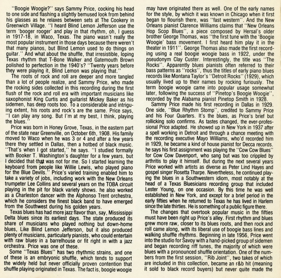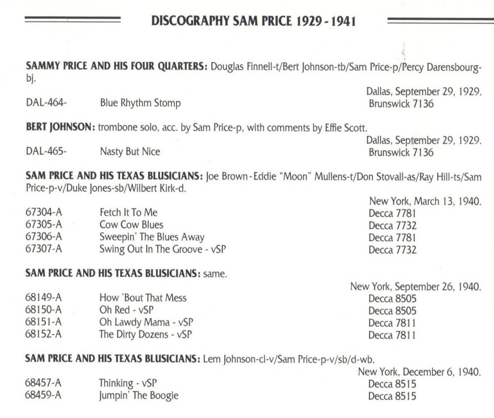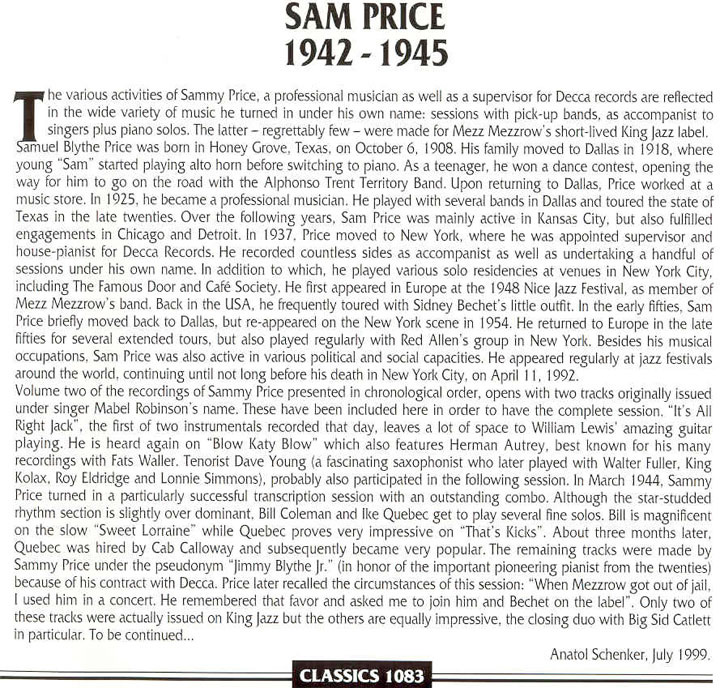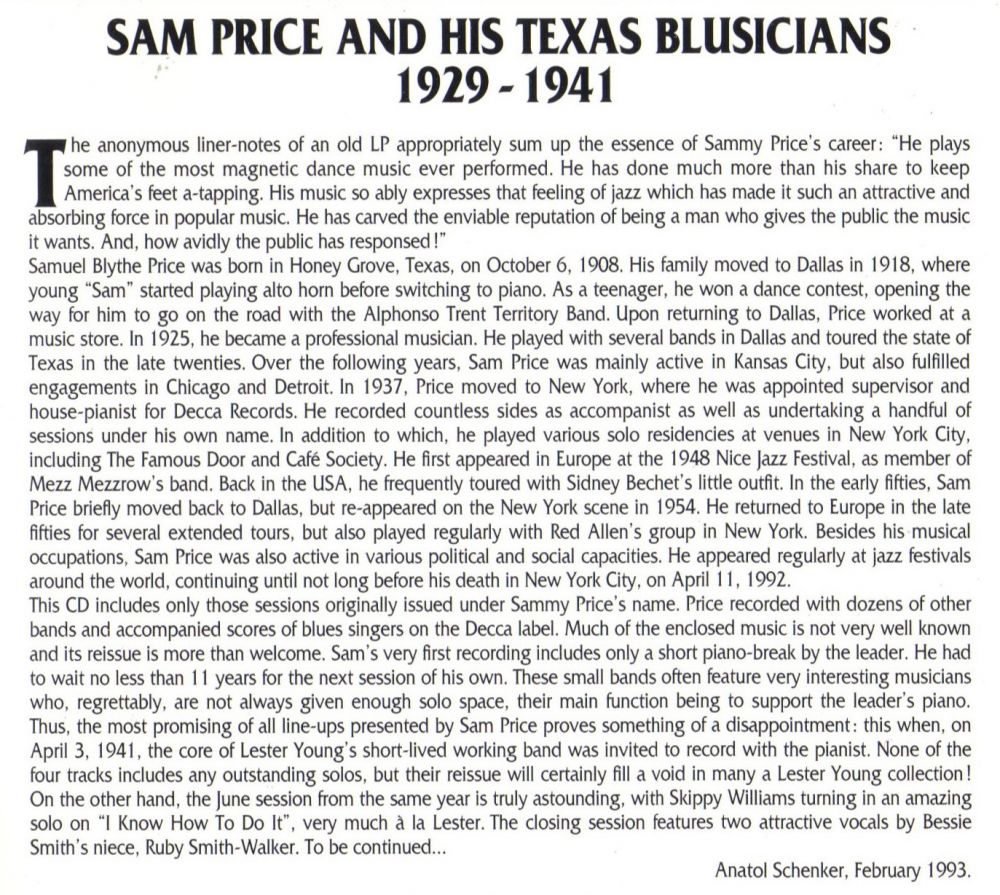 Der Pianist, Sänger und Band-Leader Sam Price wurde am 6. Oktober 1908 in Honey Grove, Texas, als Samuel Blythe Price geboren und verstarb am 14. April 1992 in seinem Heim in Harlem, New York City, an einer Herz-Attacke.