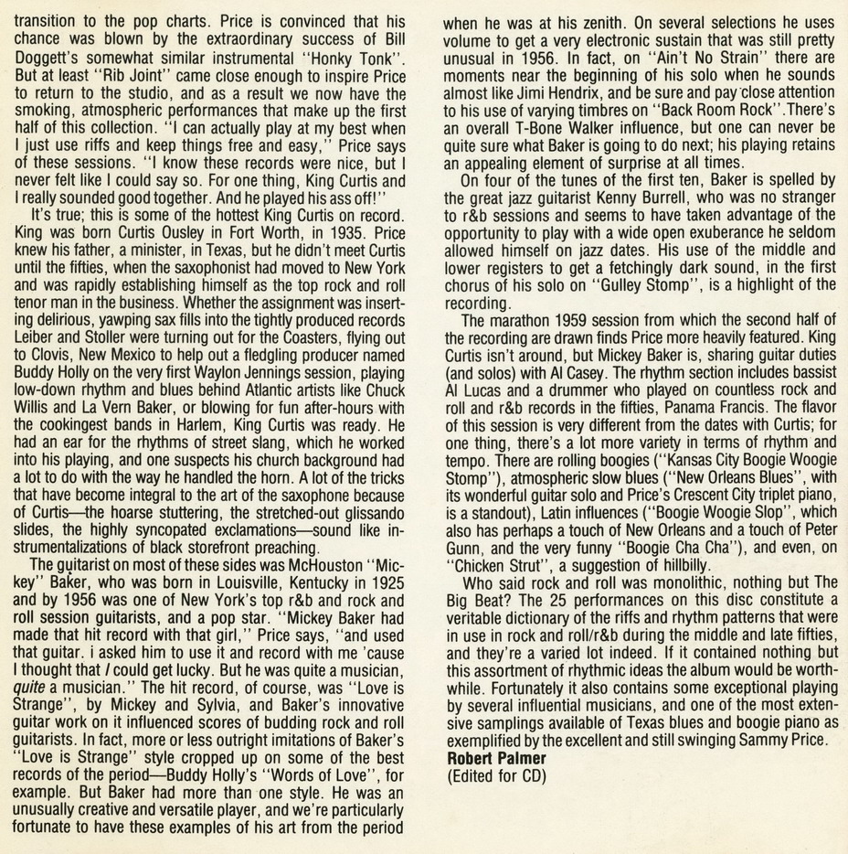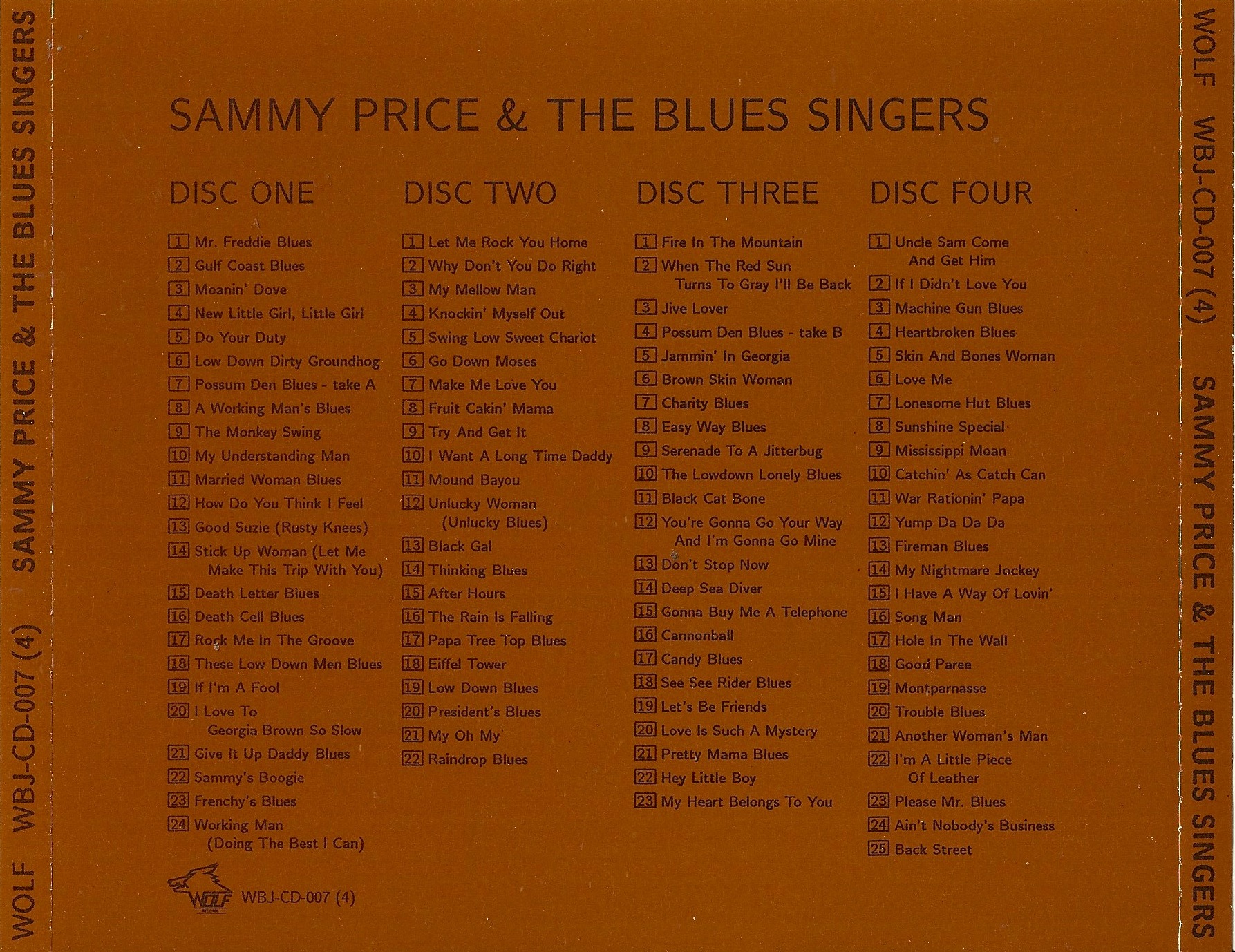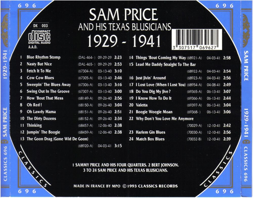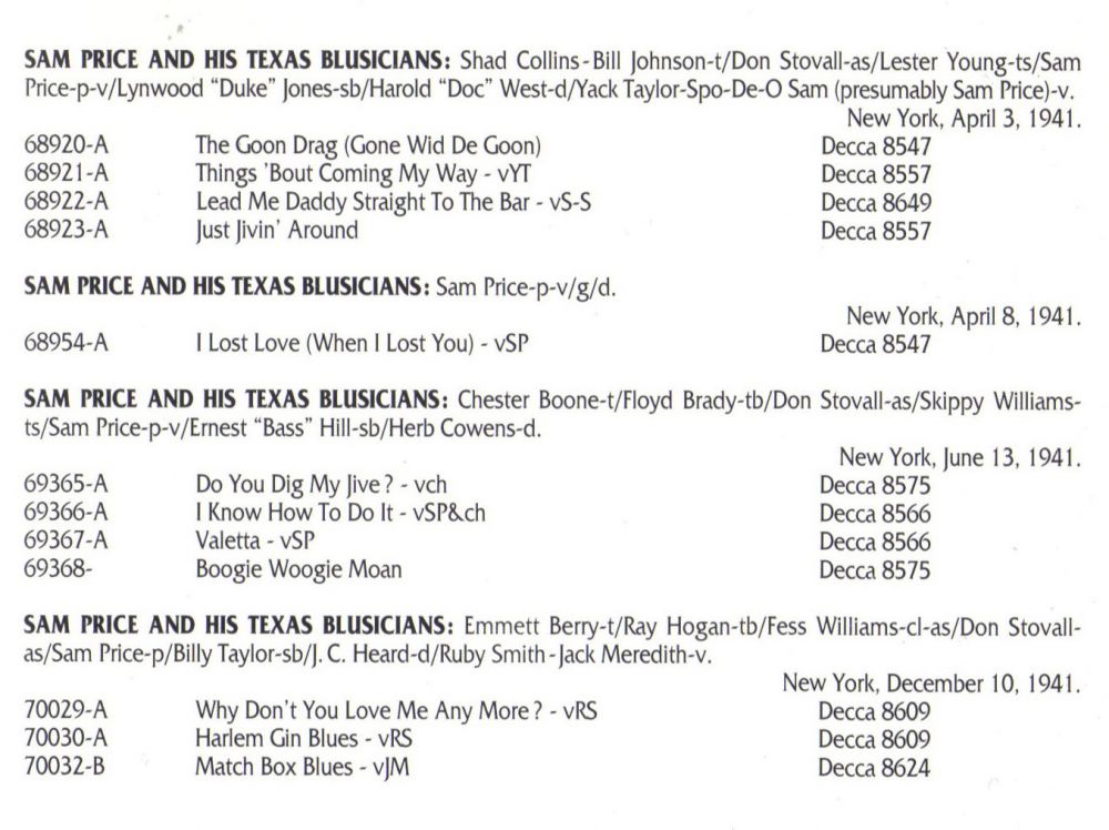 Der Pianist, Sänger und Band-Leader Sam Price wurde am 6. Oktober 1908 in Honey Grove, Texas, als Samuel Blythe Price geboren und verstarb am 14. April 1992 in seinem Heim in Harlem, New York City, an einer Herz-Attacke.