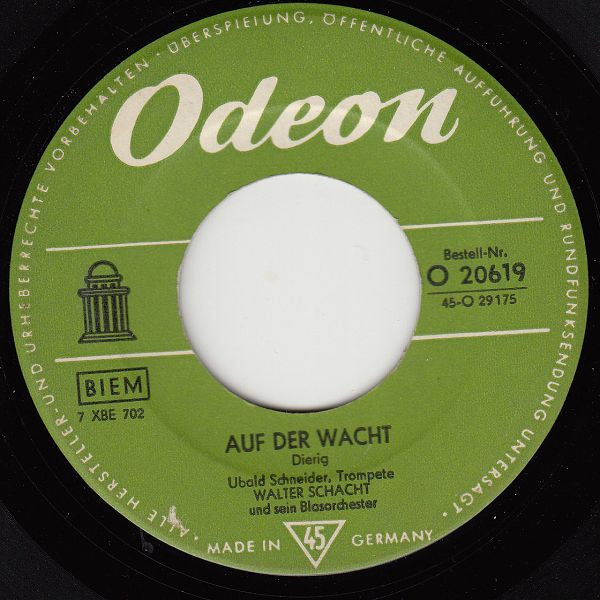 07 58....45-O 29175....UBALD SCHNEIDER, Trompete Walter Schacht und sein Blasorchester..Trompeters Wiegenlied/Auf der Wacht (dann O 20619)