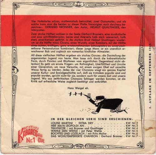 Den Namen Qualtinger brachte ich bisher nur mit Kabarett und Schauspielerei in Verbindung. Umso erstaunter war ich, als ich auf der B-Seite die angabe "Boogie Chanson" gelesen habe.