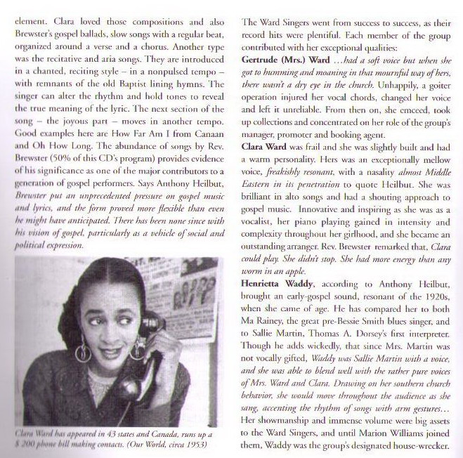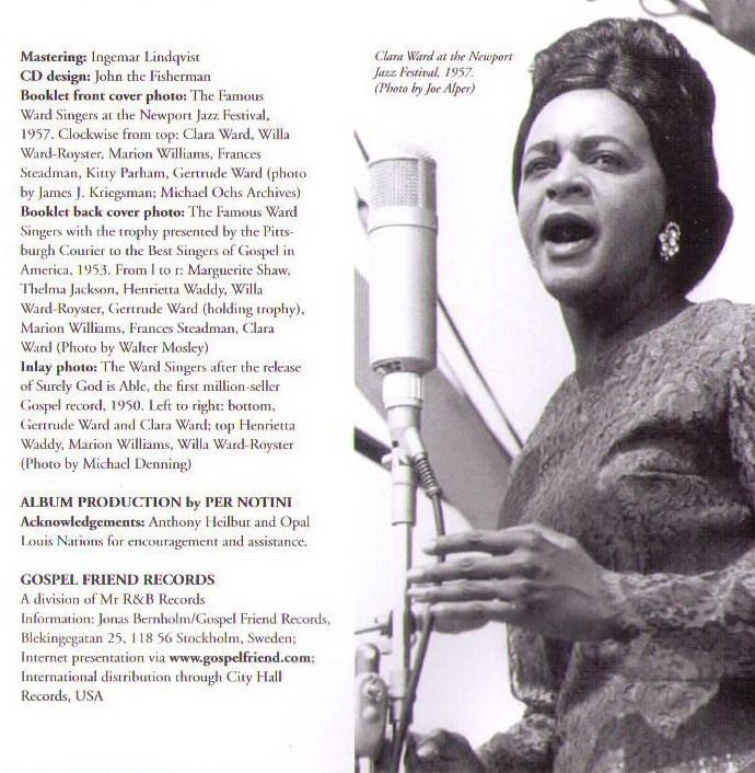 Die Gospel-Sängerin Clara Ward wurde am 21. April 1924 in Philadelphia, Pennsylvania, geboren und verstarb am 16. Jänner 1973 in Los Angeles, Kalifornien. Ihre Gesangskarriere begann sie bereits bei den von ihrer Mutter Getrude Ward 1931 gegründeten Ward Singers, die mit ihrer Schwester Willa Ward ursprünglich ein Trio waren. 1940 machte Clara Ward ihre ersten Solo-Aufnahmen. Nach und nach übernahm sie auch bei den Ward Singers den musikalischen Bereich, arrangierte, komponierte etc. und Mutter Gertrud war für die Organisation der Auftritte und Tourneen sowie für die Engagierung von Sängerinnen für diverse Projekte wie "The Clara Ward Specials" etc., zuständig. 1950 traten sie als "Clara Ward And The Famous Ward Singers" erstmals in der newyorker Carnegie Hall auf.