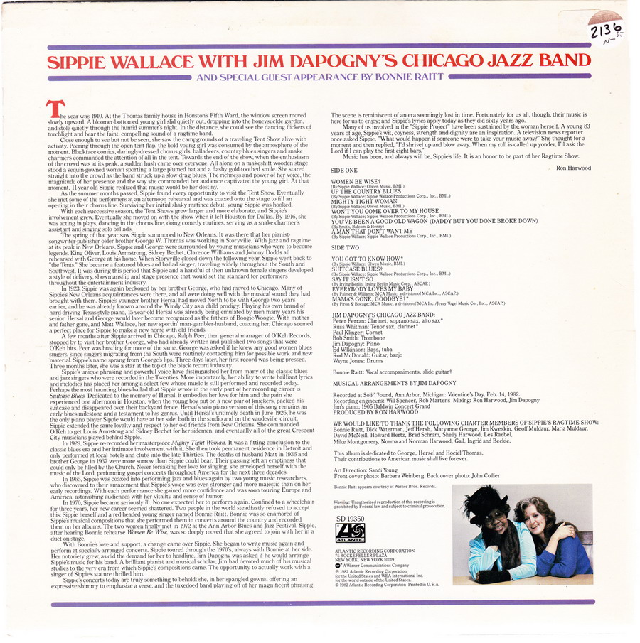 Wallaces Backup-Gruppe war die Chicago Jazz Band des Pianisten James Dapogny, bestehend aus Paul Klinger am Kornett, Bob Smith an der Posaune und Russ Whitman und Peter Ferran an den Schilfrohren.