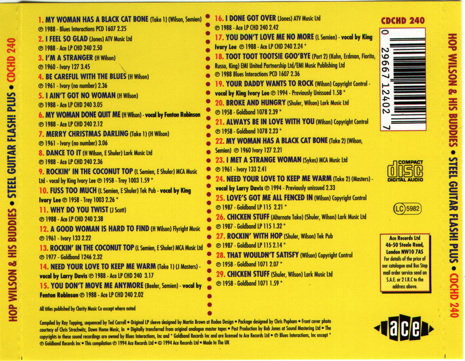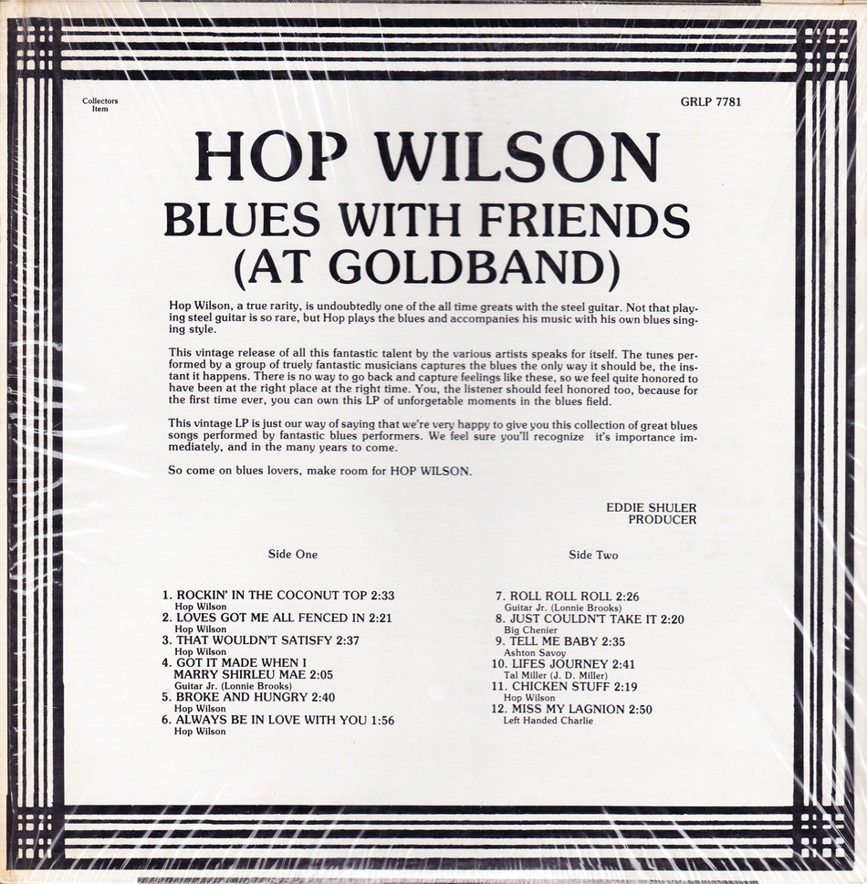 He was described as having "absorbed not only the black Texas blues as sung and played by the likes of Blind Lemon Jefferson but also the heavily amplified, often wildly distorted, steel guitar sounds of the region's white Western Swing bands." Hop Wilson didn't lead his own sessions until 1960, when he signed with the Ivory record label. Wilson only recorded for the label for two years -- his final sessions were in 1961. After 1961, Wilson concentrated on playing local Houston clubs and bars.