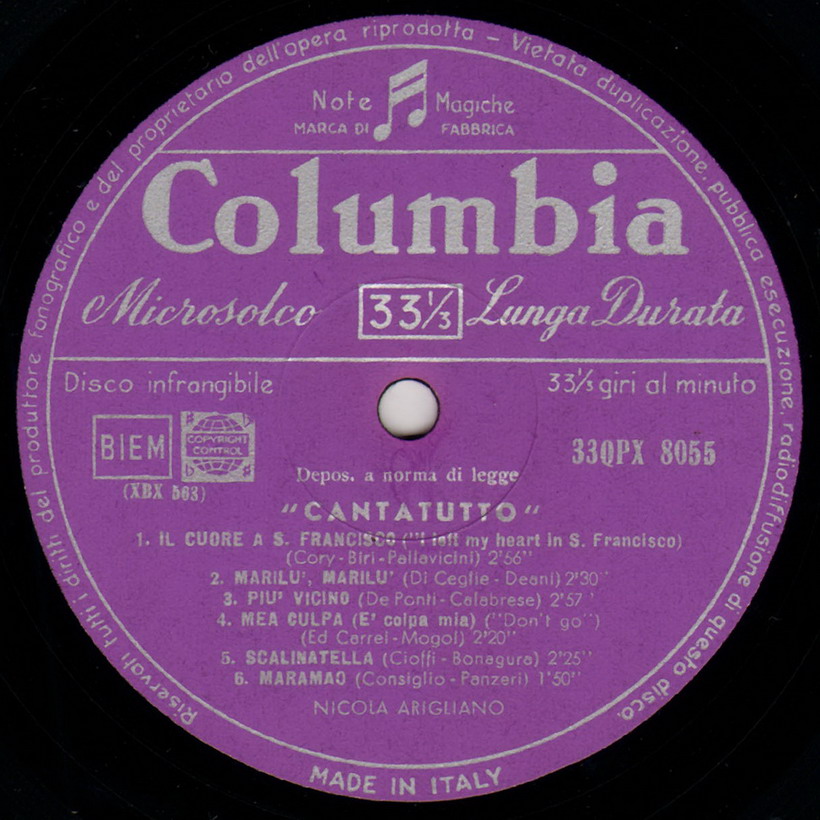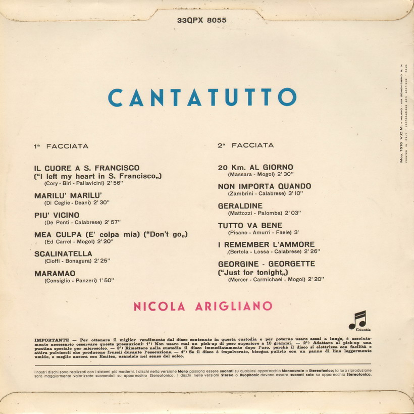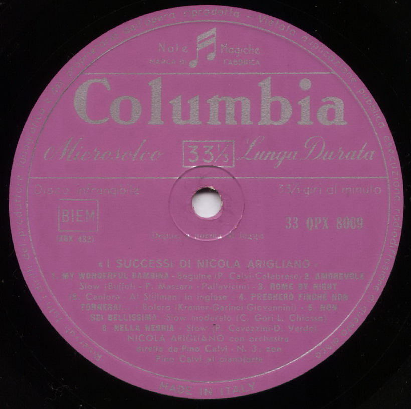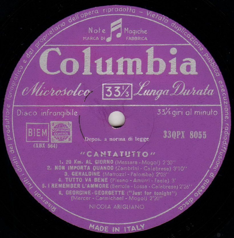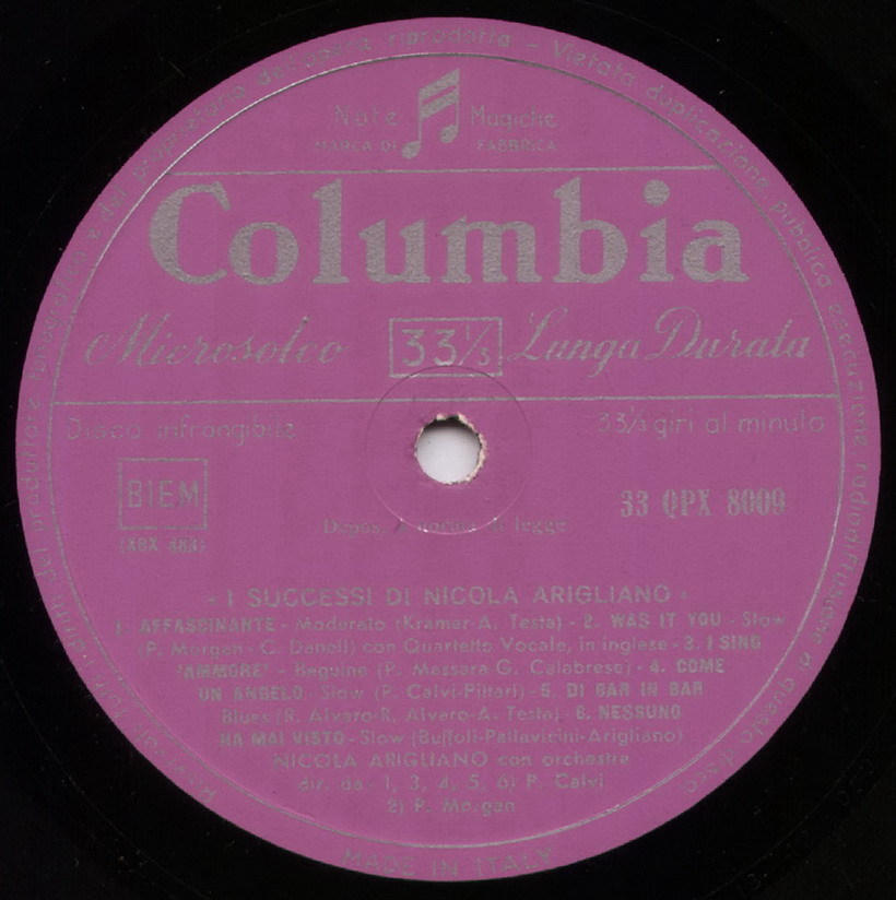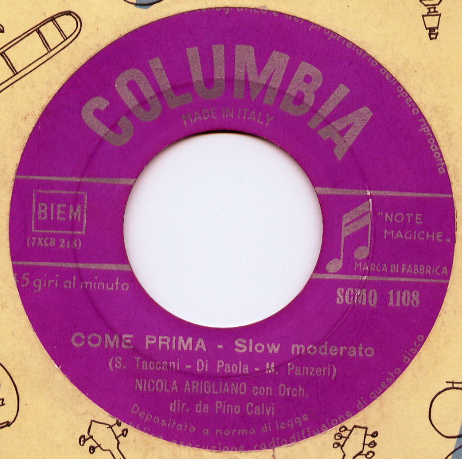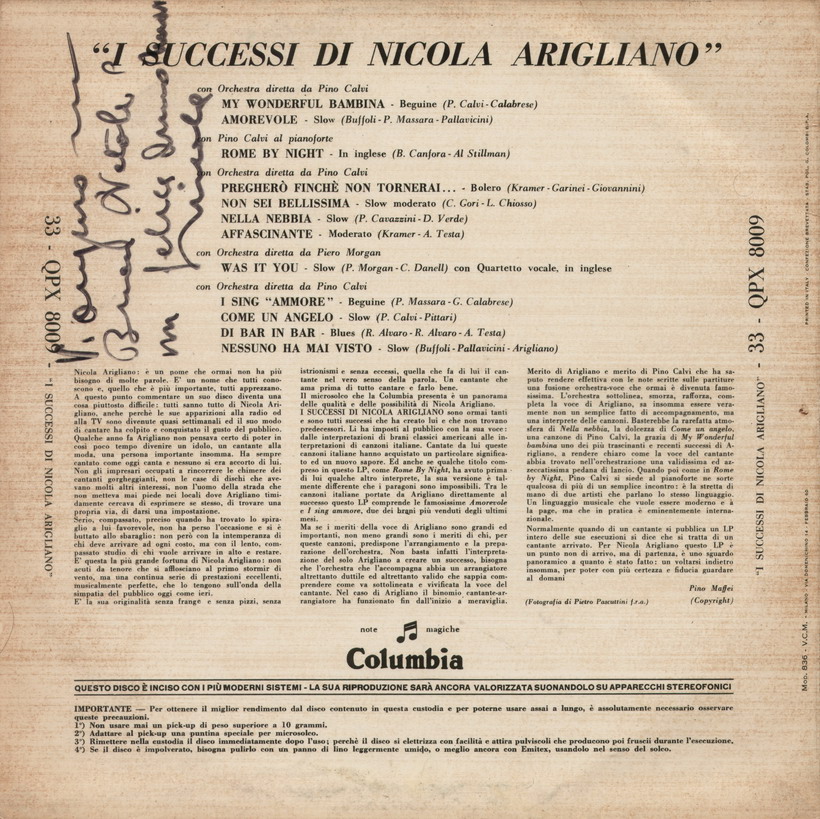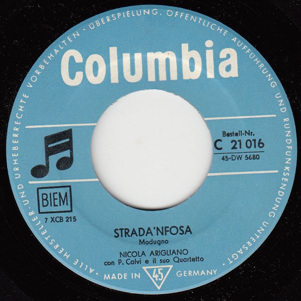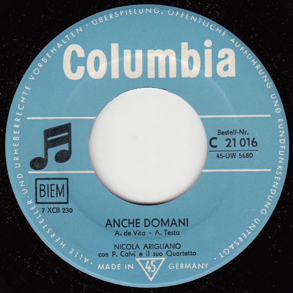 Der italienische Pop- und Jazzsänger Nicola Arigliano, der auch den Beinamen "König des italienischen Swing" erhielt, wurde am 6. Dezember 1923 in Squinzano, Provinz Lecce, Italien, geboren und verstarb am 30. März 2010 in Calimera, Provinz Lecce, Italien. Bereits in jungen Jahren ging er nach Mailand, um als Sänger, Pianist und Entertainer zu arbeiten. 1956 hatte er sein Platten-Debut bei RCA Italiana, wo aber nur Schellacks von ihm veröffentlicht wurden. Seine größten Erfolge konnte er dann bei COLUMBIA auf 45-RPM verzeichnen.