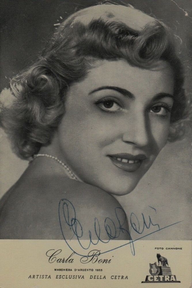 Die italienische Sängerin Carla Boni wurde am 17. Juli 1925 in Ferrara als Carla Gaiano geboren und verstarb am 17. Oktober 2009 in Rom. Sie war verheiratet mit dem Sänger Gino Latilla (7. November 1924-11. September 2011), mit dem sie auch eine Reihe von Duette einspielte.