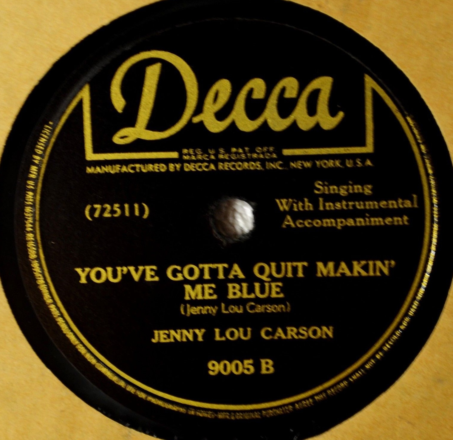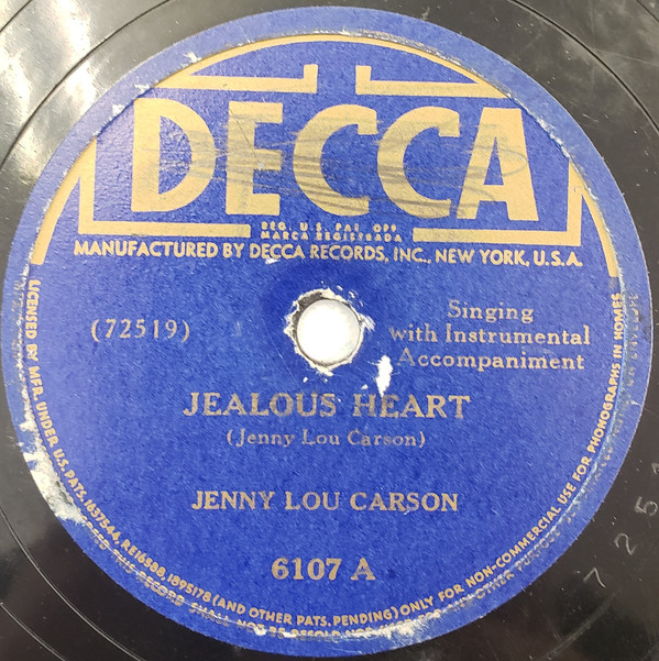 Jenny Lou Carson, (January 13, 1915–December 16, 1978), born Virginia Lucille Overstake, was an American country music singer-songwriter and the first woman to write a No. 1 country music hit. From 1945 to 1955 she was one of the most prolific songwriters in country music.