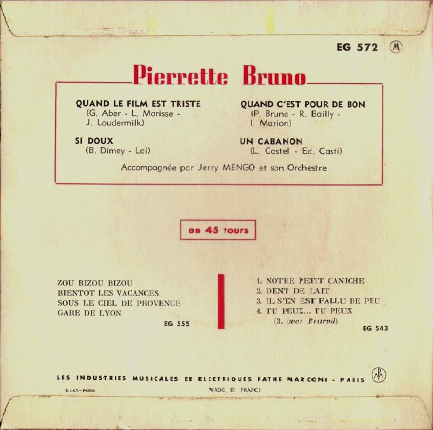 Pierrette Bruno est une actrice et chanteuse française, née le 22 août 1928 (à Marseille (Bouches-du-RhÎne)