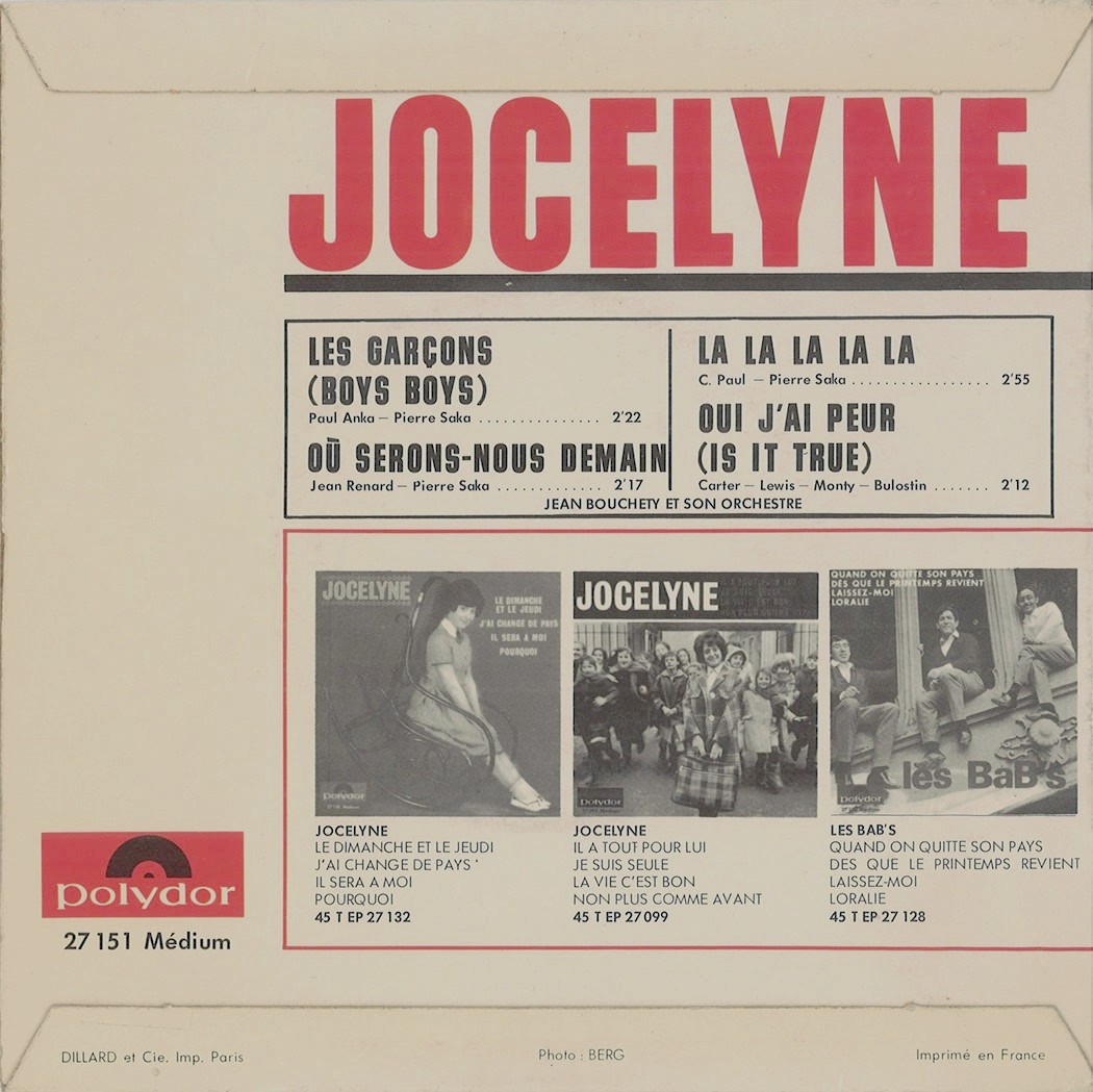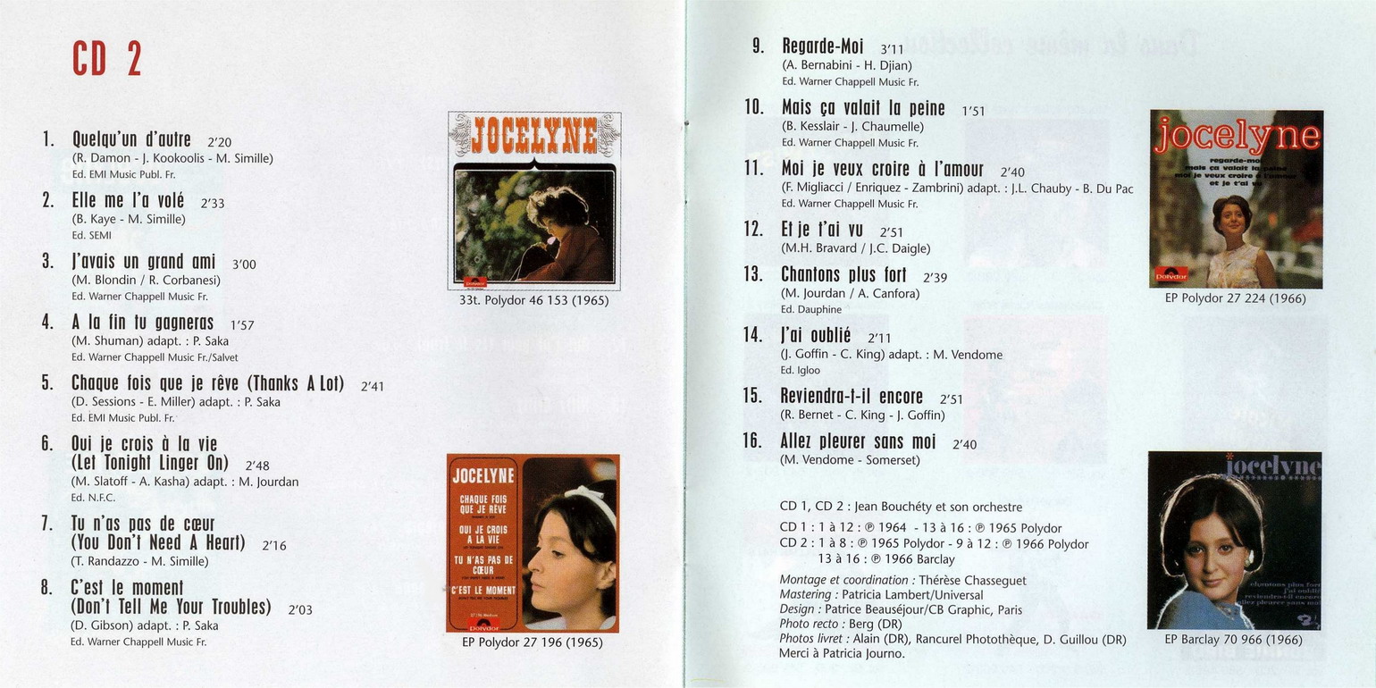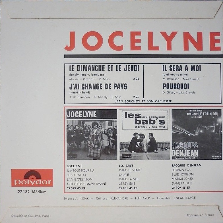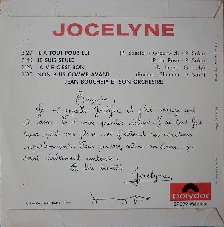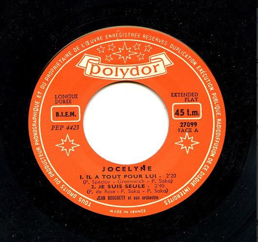 Jocelyne (born: Jocelyne Esther Journo) hat einige französische Titel (meist Coverversionen) auf Polydor veröffentlicht).