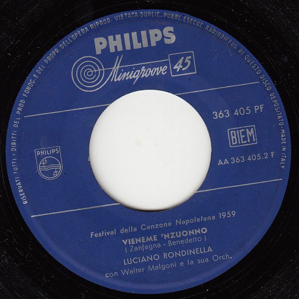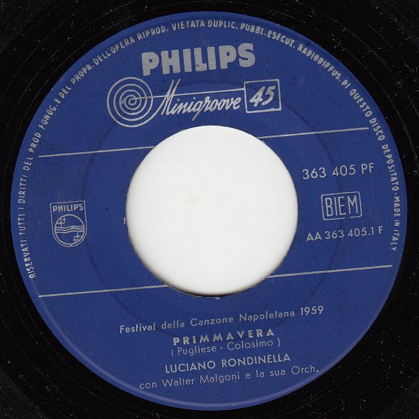 ?? 59....363 405 PF....Festival della Canzone Napoletana 1959 LUCIANO RONDINELLA con Walter Malgoni e la sua Orch. ..Primmavera/Vieneme 'nzuonno