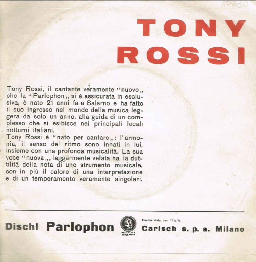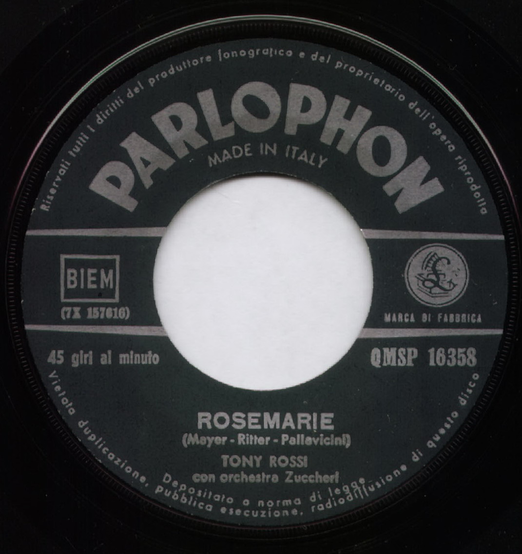 Tony Rossi und seine Singles: PARLOPHON (I) ?? 62....QMSP 16329....Tony Rossi e i Brummels..I Cry For You... Bambina (7X 157566)/Ferma questa notte (Retiens la nuit) (7X 157567) 06 62....QMSP 16330....TONY ROSSI con l'orchestra Mazzocchi..Ma perchè (7X 157568)/Tutto l’amore al mondo (7X 157569) ?? 62....QMSP 16337....TONY ROSSI con l'orchestra Mazzocchi..Marianna (7X 157582)/Dolce, Dolcissima (7X 157583) ?? 63….QMSP 16344....TONY ROSSI con l'orch. Zuccheri e coretto..Credi (7X 157602)/Vini vini (7X 157603) 04 64….QMSP 16358....TONY ROSSI con orchestra Zuccheri..Rosemarie (7X 157616)/TONY ROSSI con orchestra Mazzocchi..Non andartene (7X 157617) ?? 65….QMSP 16376....TONY ROSSI con l’orchestra Zuccheri..Non devi piangere (7X 157626)/Pensiamoci bene (7X 157627) Keep Searchin’ Gerd