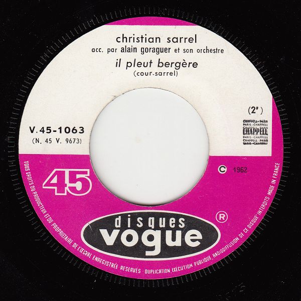 Der Songschreiber und Interpret Christian Sarrel, manchmal auch Chris Sarrel, wurde in Lyon als Christian Sainturat geboren und verstarb bereits 1999. Seine Schallplatten-Karriere dürfte vermutlich bei ODEON etwa um 1959 begonnen haben. Etwa 1961 sang er bei PHILIPS mit sich selber (Christian Sarrel avec Christian Sarrel) und machte noch weitere Einspielungen, kurz auch bei SINFONIA, bis er 1962 zu VOGUE wechselte.