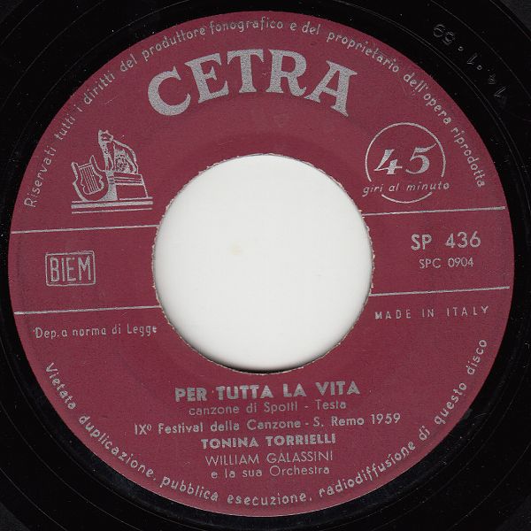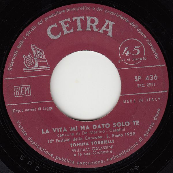 02 59....SP 436....TONINA TORRIELLI WILLIAM GALASSINI e la sua Orchestra..La vita mi ha dato solo te (SPC 0911) /Per tutta la vita (SPC 0904)
