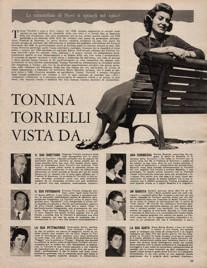 Die italienische Sängerin Tonina Torrielli wurde am 22. März 1934 in Serravalle Scrivia, Region Piemont, Italien, geboren und war bis etwa 1965 im Musik-Business aktiv. Danach gab es nur noch sporadisch den einen oder anderen Auftritt von ihr.