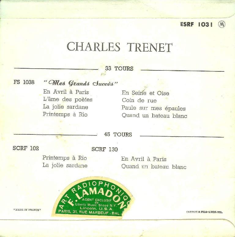 ?? 54....SCRF 130....CHARLES TRENET Orchestre direction : Jo BOYER..En avril à Paris (7 XCL 5065)/Quand un bateau blanc (7 XCL 5066)