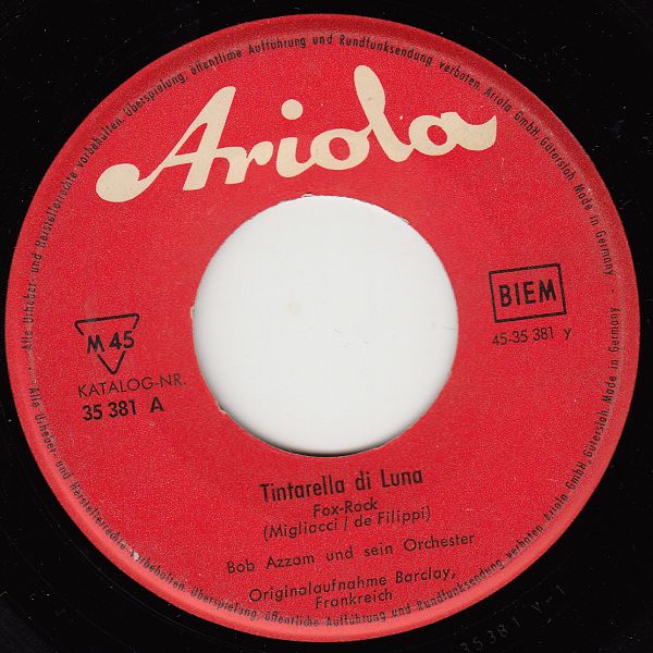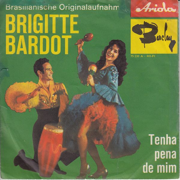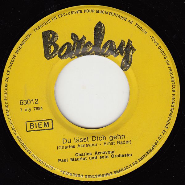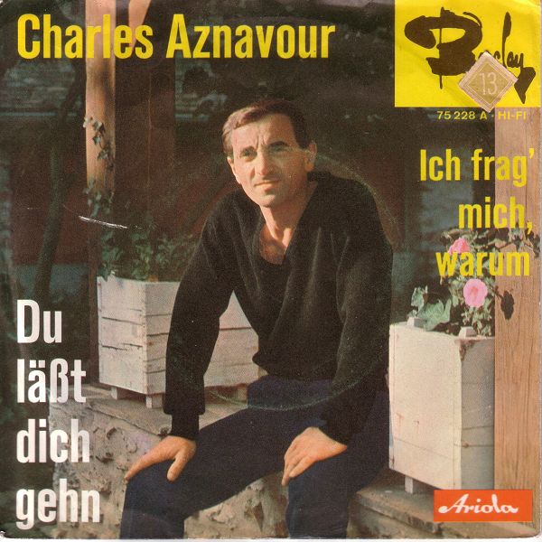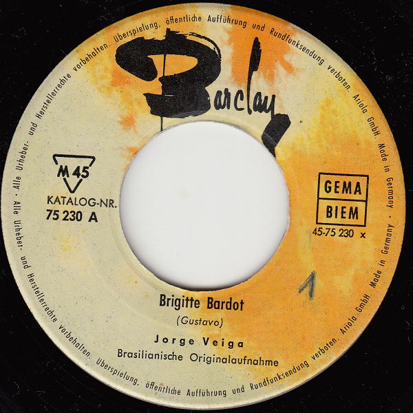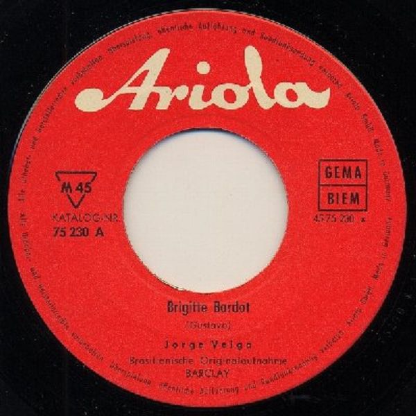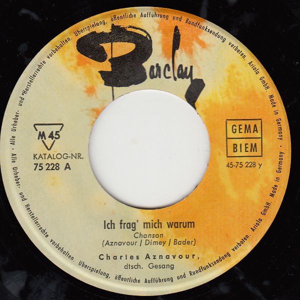 In der Rocknroll-Ära und etwas darüber gab es BARCLAY-Aufnahmen im deutschsprachigen Raum auf dem ARIOLA-Label ausschließlich in Deutschland. In der Schweiz und Österreich konnten BARCLAY-Aufnahmen ausschließlich auf BARCLAY-Schallplatten erworben werden, da die Rechte über die MUSIKVERTRIEB AG ZÜRICH gingen. In der Übergangszeit, etwa Ende 1961, dürfte es dann nur mehr um den Label-Namen sebst gegangen sein, denn da gibt es Beispiele von BARCLAY und ARIOLA-Singles, beide mit "Made in Germany"-Aufdruck, die mit Ausnahme des Labelnamens und -logos völlig ident sind. Jene mit BARCLAY-Logo waren für Österreich und die Schweiz bestimmt und jene mit ARIOLA-Logo für Deutschland. Da beide Varianten in Deutschland hergestellt wurden, waren auch die Hüllen für beide Varianten verwendbar, wie man bei den Beispielen von Charles Aznavour und "Brigitte Bardot", die zwei letzten der folgenden Beispiele, wunderbar sehen kann. Die gelbe BARCLAY mit der Nummer 63012 dürfte die letzte aus dieser Serie gewesen sein. Außerdem vermute auch, dass es die Nummer 75 228 A auch mit Label-Logo ARIOLA gegeben hat, ich konnte aber im Netz nichts finden. Das ARIOLA-Beispiel für "Brigitte Bardot" habe ich mir von Ralf (Single45rpm) ausgeborgt. Ich hoffe, er ist mir nicht böse.