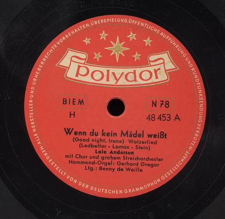09 58....E 20 058....LALE ANDERSEN mit Orchester Dirigent: Bruno Seidler-Winkler..Lilli Marlen (Lied eines jungen Wachtpostens)/Drei rote Rosen (7 MW 649)........Original-Aufnahmen vom August 1939