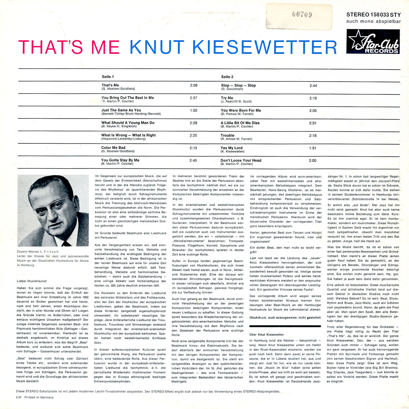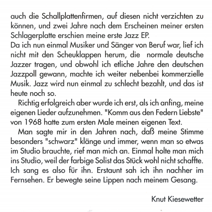 Zusammen mit seinem Geschwistern Sigrun und Hartmut Kiesewetter wurde seine Musik folklastiger und die drei Kiesewetters traten auch im Star-Club auf, weshalb dann eine LP auf dem Star-Club-Label erschien. Ende der 60er wechselte er ins Liedermacher-Fach (die LP "Fahr mit mir den Fluß hinunter" habe ich geliebt...). Zunehmend wurde er auch als Produzent aktiv (z.B. für Volker Lechtenbrink, Hannes Wader, Fiede Kay und Jochen Steffen). Da "seine" Musik immer politischer wurde, wurden seine Produktionen bei der BASF geparkt, damals irgendwie verschwippschwägert mit der Polydor. BASF war ein Plattenlabel ohne gescheites Marketing, so dass die Polydor ihre vertraglichen Verpflichtungen erfüllte und dennoch wenig verkauft wurde. So hat es mir jedenfalls Knut Kiesewetter selbst einmal erzählt.
