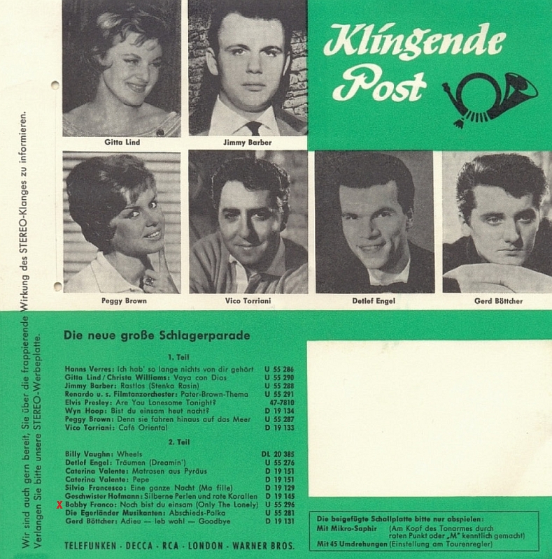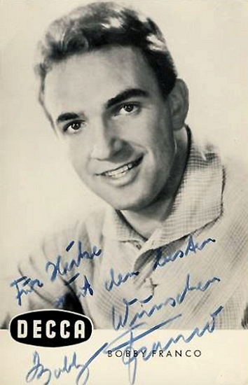 FRANCO, BOBBY/BOB, Sänger, 1958/59 Decca, 25.02.1961 Vorentscheidung zum Grand Prix d’Eurovision de la Chanson im Kurtheater in Bad Homburg ("Langsamer Walzer"), 1961 Telefunken, 1963 als BOB FRANCO auf Philips