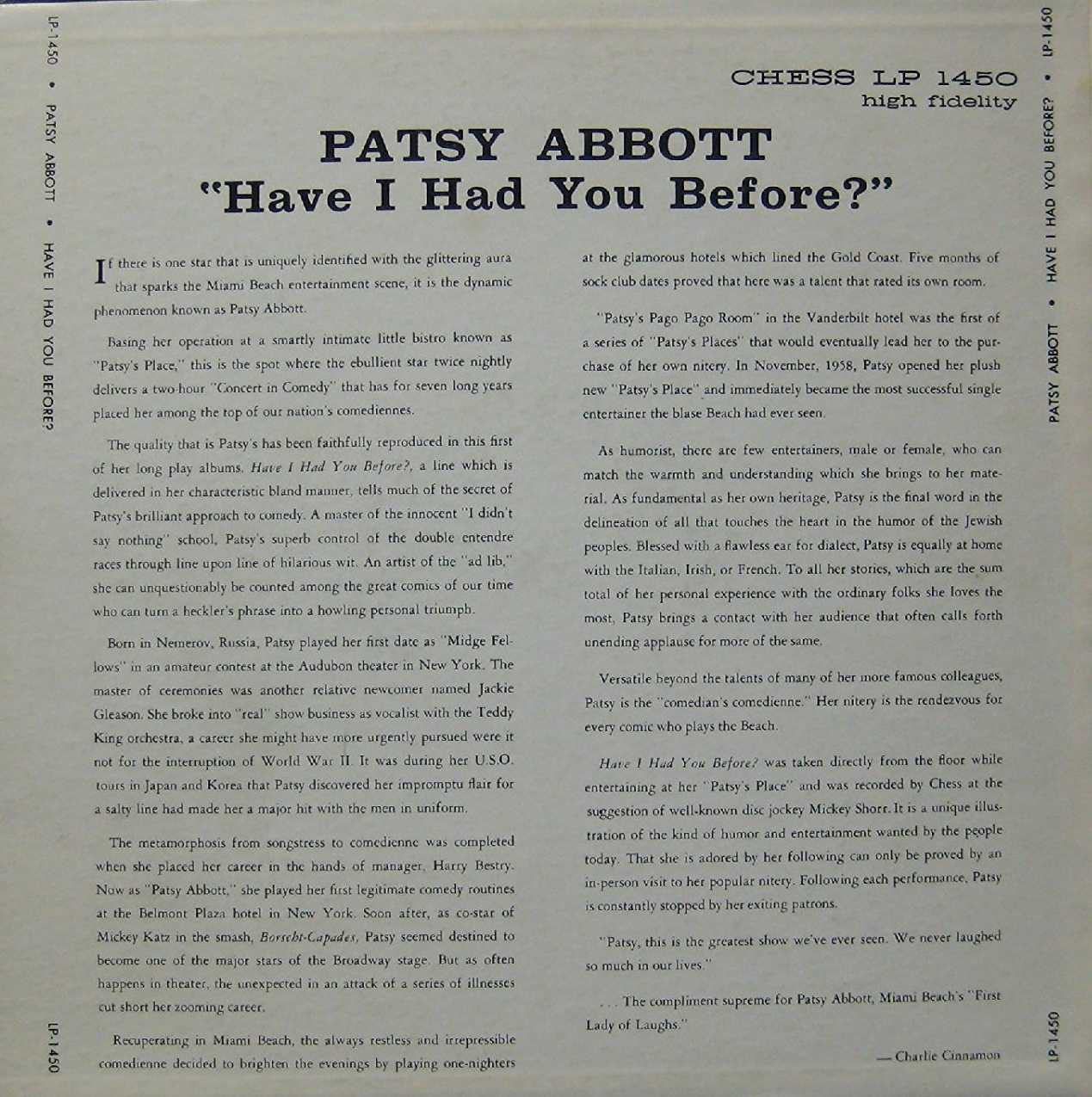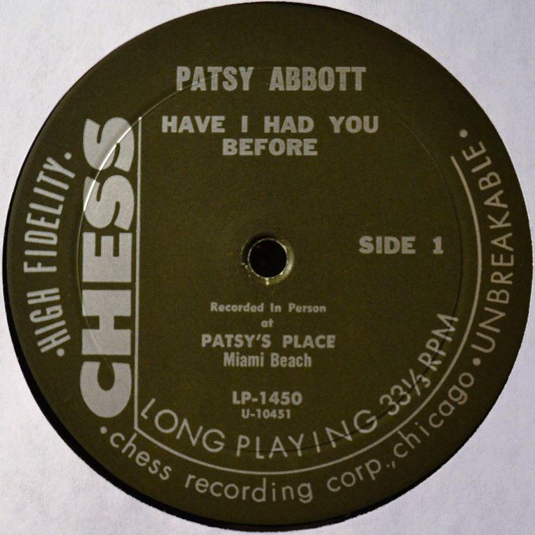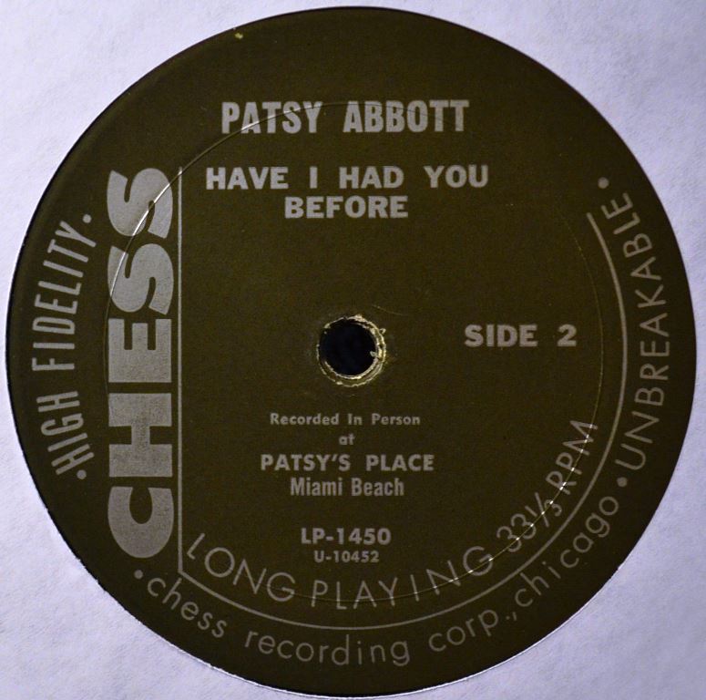 Patsy Abbott dürfte 1921, möglicherweise als Goldie Schwartz, geboren worden sein und wuchs in der newyorker Bronx auf. Ihre künstlerische Heimat war aber, wie mir scheint, später dann Florida. Ich bekam von ihr eine Single auf dem ABBOTT-Label, offenbar ihr eigenes, und fand im Netz neben den zwei LPs