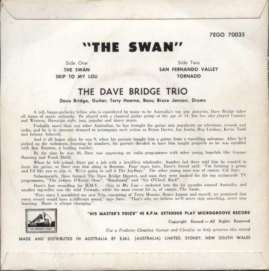 Dave Bridge war 1957 Gründungsmitglied der Joy Boys, der Backing-Band für den Pionier des australischen Rock'n'roll-Stars Col Joye, und spielte mit ihnen bis 1961. Danach gründete er seine eigene Instrumentalband, das Dave Bridge Quartet.