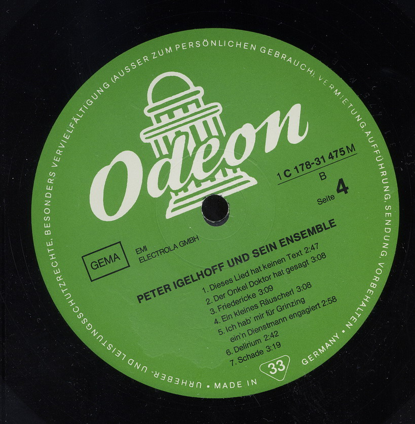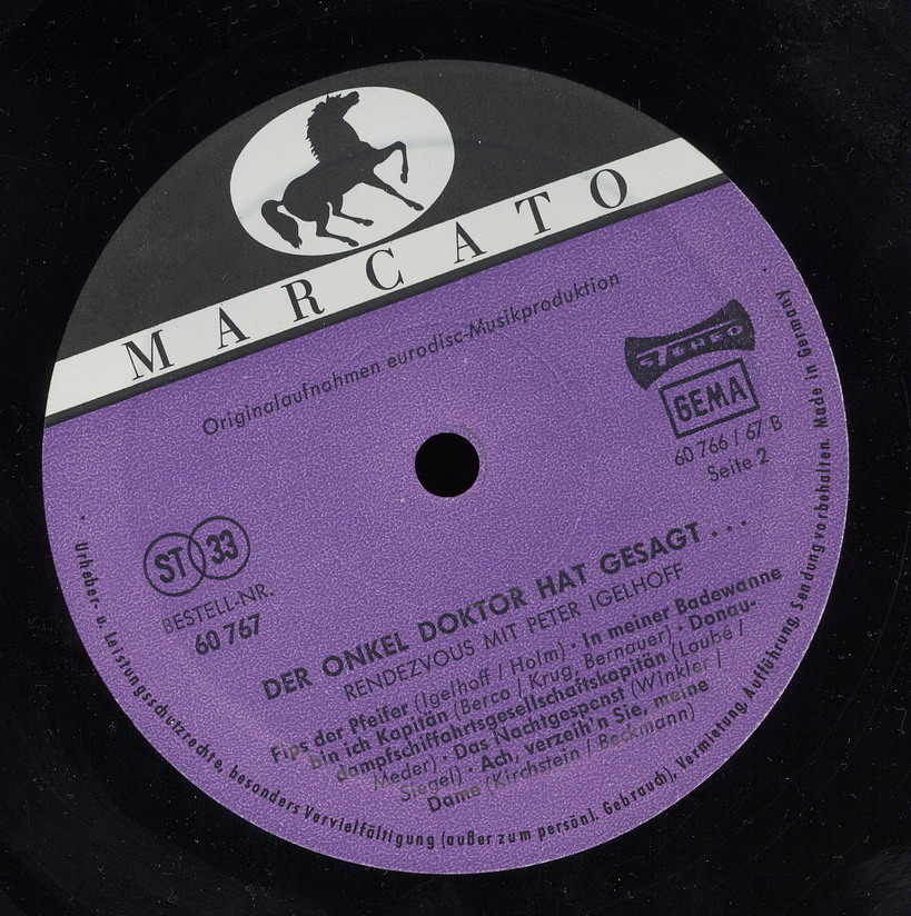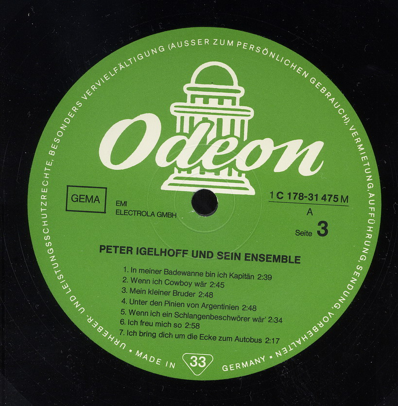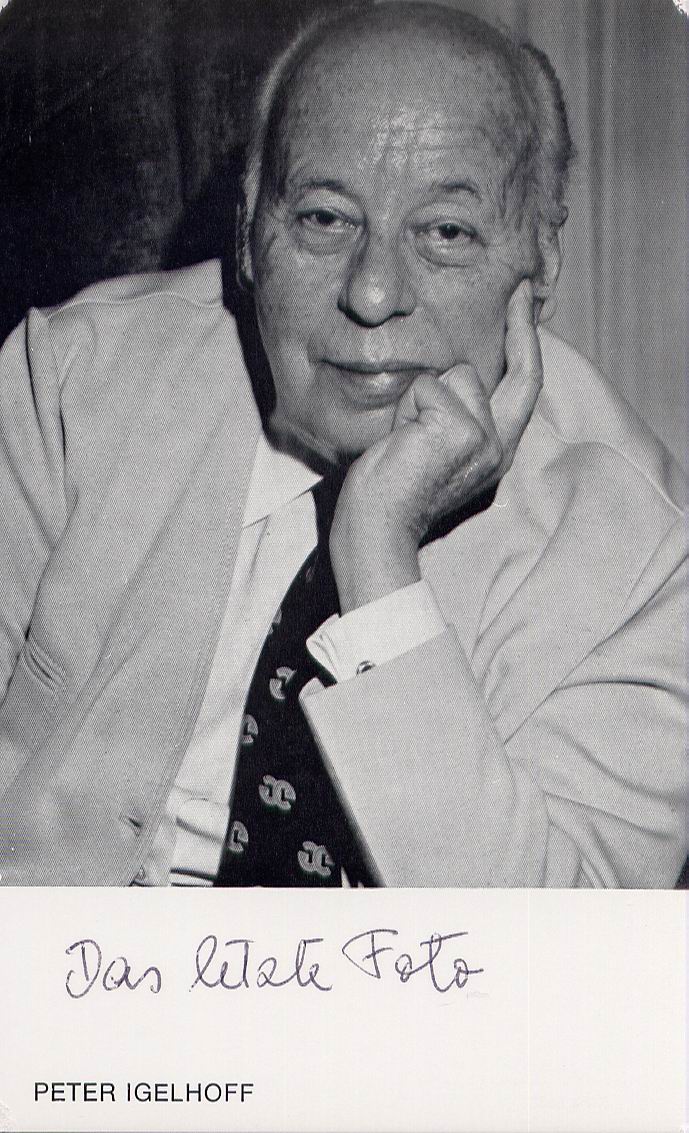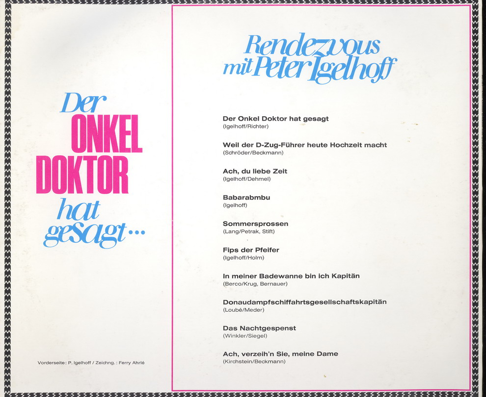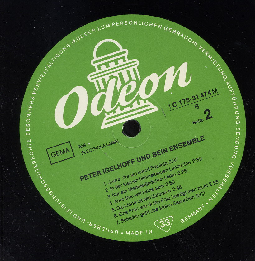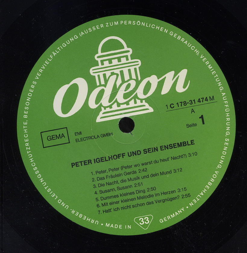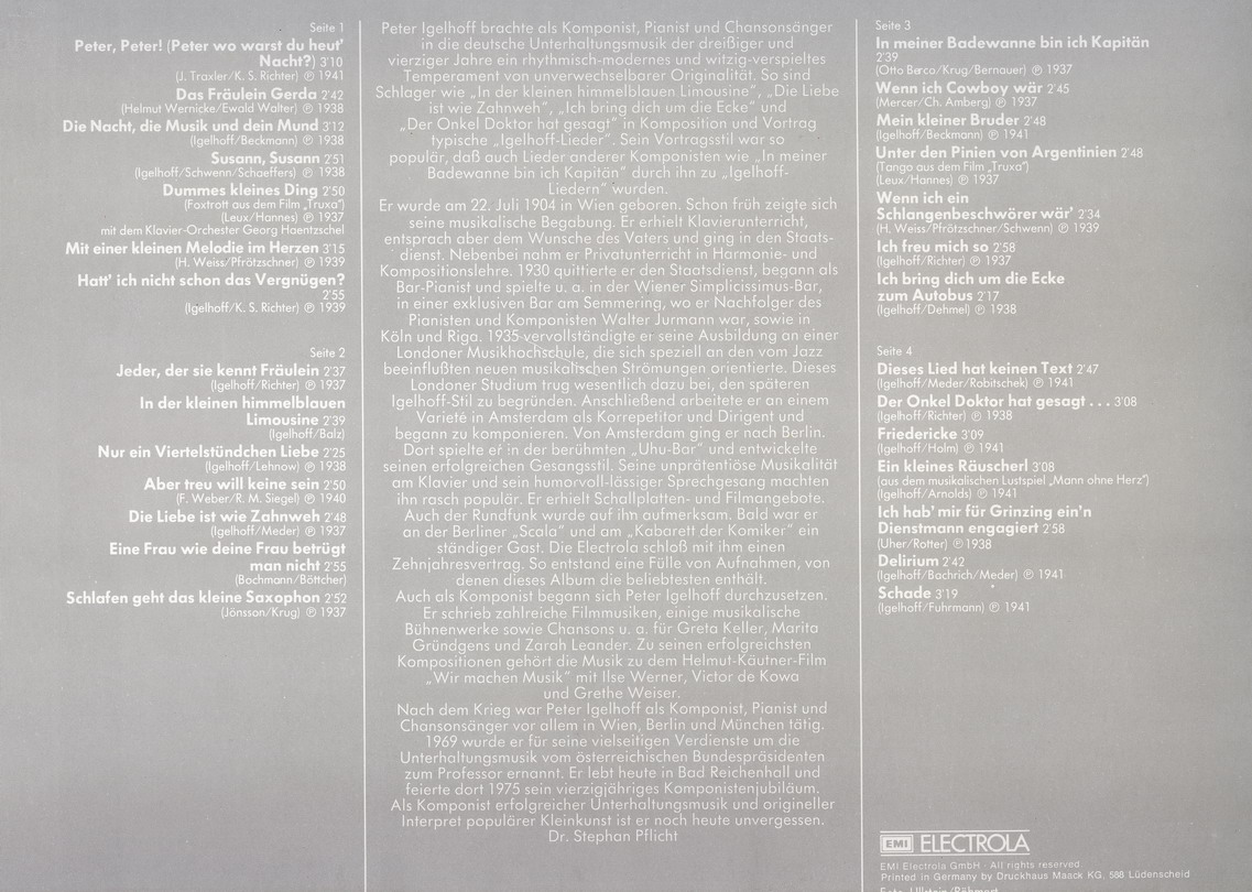 Der Musiker und Komponist Peter Igelhoff wurde am 22. Juli 1904 in Wien, Österreich, als Rudolf August Ordnung geboren und verstarb am 8. April 1978 in Bad Reichenhall, Oberbayern. Er schrieb über tausend Lieder und Schlager, die er manchmal auch selbst vortrug, aber seinem Jahrgang entsprechend, hauptsächlich in der Zwischenkriegszeit. Seine einzige echte Solo-Single auf Vinyl war ein Novelty, welches ich musikalisch eher als zeitlos einordnen würde. Trotzdem gehört er für mich mit einem Titel zu den ganz wenigen echten deutschen Rocknrollern, allerdings nur als Komponist. Ich meine damit "Juke - Box - Baby" von Little Gerhard, wo mit Ausnahme des Sängers der Däne ist, aber in deutscher Sprache singt, alles aus unserem Sprachgebiet kommt, also keine Cover-Version ist, und sich mit USA-Aufnahmen leicht messen kann.