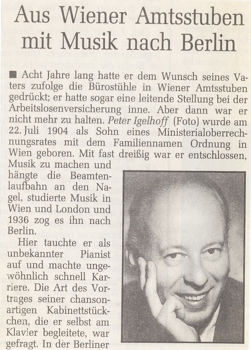 Ursprünglich war Peter Igelhoff Beamter bei der Stadt Wien, studierte aber ab 1932 Musik in Wien und London und ging 1935 nach Berlin, wo er als Unterhalter am Klavier und auch in diversen Kabaretts auftrat und damit seine musikalische Karriere begann.